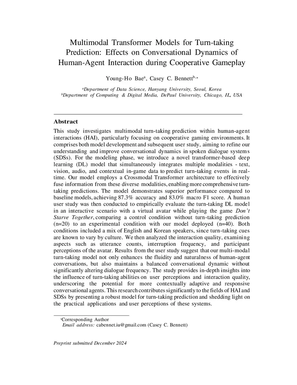 This study investigates multimodal turn-taking prediction within human-agent interactions (HAI), particularly focusing on cooperative gaming environments. It comprises both model development and subsequent user study, aiming to refine our understanding and improve conversational dynamics in spoken dialogue systems (SDSs). For the modeling phase, we introduce a novel transformer-based deep learning (DL) model that simultaneously integrates multiple modalities - text, vision, audio, and contextual in-game data to predict turn-taking events in real-time. Our model employs a Crossmodal Transformer architecture to effectively fuse information from these diverse modalities, enabling more comprehensive turn-taking predictions. The model demonstrates superior performance compared to baseline models, achieving 87.3% accuracy and 83.0% macro F1 score. A human user study was then conducted to empirically evaluate the turn-taking DL model in an interactive scenario with a virtual avatar while playing the game "Dont Starve Together", comparing a control condition without turn-taking prediction (n=20) to an experimental condition with our model deployed (n=40). Both conditions included a mix of English and Korean speakers, since turn-taking cues are known to vary by culture. We then analyzed the interaction quality, examining aspects such as utterance counts, interruption frequency, and participant perceptions of the avatar. Results from the user study suggest that our multimodal turn-taking model not only enhances the fluidity and naturalness of human-agent conversations, but also maintains a balanced conversational dynamic without significantly altering dialogue frequency. The study provides in-depth insights into the influence of turn-taking abilities on user perceptions and interaction quality, underscoring the potential for more contextually adaptive and responsive conversational agents.