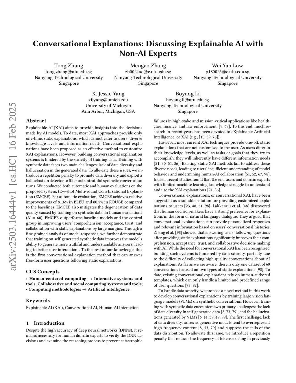 Explainable AI (XAI) aims to provide insights into the decisions made by AI models. To date, most XAI approaches provide only one-time, static explanations, which cannot cater to users' diverse knowledge levels and information needs. Conversational explanations have been proposed as an effective method to customize XAI explanations. However, building conversational explanation systems is hindered by the scarcity of training data. Training with synthetic data faces two main challenges: lack of data diversity and hallucination in the generated data. To alleviate these issues, we introduce a repetition penalty to promote data diversity and exploit a hallucination detector to filter out untruthful synthetic conversation turns. We conducted both automatic and human evaluations on the proposed system, fEw-shot Multi-round ConvErsational Explanation (EMCEE). For automatic evaluation, EMCEE achieves relative improvements of 81.6% in BLEU and 80.5% in ROUGE compared to the baselines. EMCEE also mitigates the degeneration of data quality caused by training on synthetic data. In human evaluations (N=60), EMCEE outperforms baseline models and the control group in improving users' comprehension, acceptance, trust, and collaboration with static explanations by large margins. Through a fine-grained analysis of model responses, we further demonstrate that training on self-generated synthetic data improves the model's ability to generate more truthful and understandable answers, leading to better user interactions. To the best of our knowledge, this is the first conversational explanation method that can answer free-form user questions following static explanations.