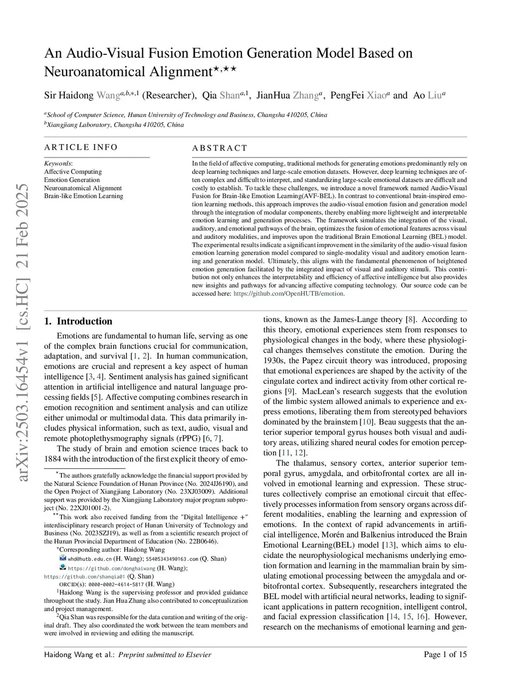 An Audio-Visual Fusion Emotion Generation Model Based on Neuroanatomical Alignment