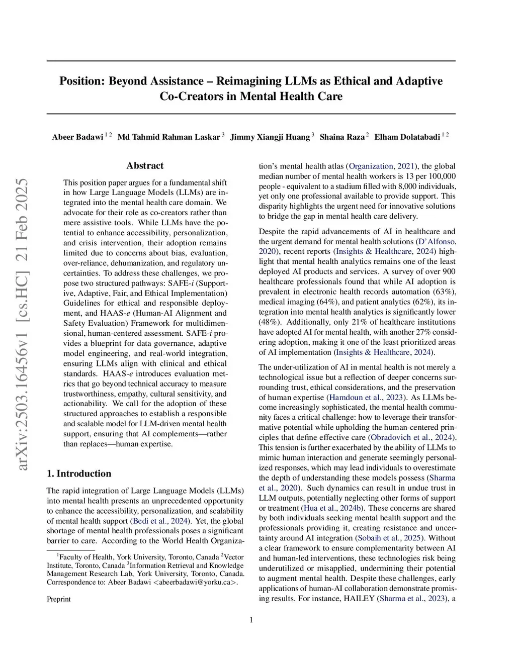 This position paper argues for a fundamental shift in how Large Language Models (LLMs) are integrated into the mental health care domain. We advocate for their role as co-creators rather than mere assistive tools. While LLMs have the potential to enhance accessibility, personalization, and crisis intervention, their adoption remains limited due to concerns about bias, evaluation, over-reliance, dehumanization, and regulatory uncertainties. To address these challenges, we propose two structured pathways: SAFE-i (Supportive, Adaptive, Fair, and Ethical Implementation) Guidelines for ethical and responsible deployment, and HAAS-e (Human-AI Alignment and Safety Evaluation) Framework for multidimensional, human-centered assessment. SAFE-i provides a blueprint for data governance, adaptive model engineering, and real-world integration, ensuring LLMs align with clinical and ethical standards. HAAS-e introduces evaluation metrics that go beyond technical accuracy to measure trustworthiness, empathy, cultural sensitivity, and actionability. We call for the adoption of these structured approaches to establish a responsible and scalable model for LLM-driven mental health support, ensuring that AI complements, rather than replaces, human expertise.