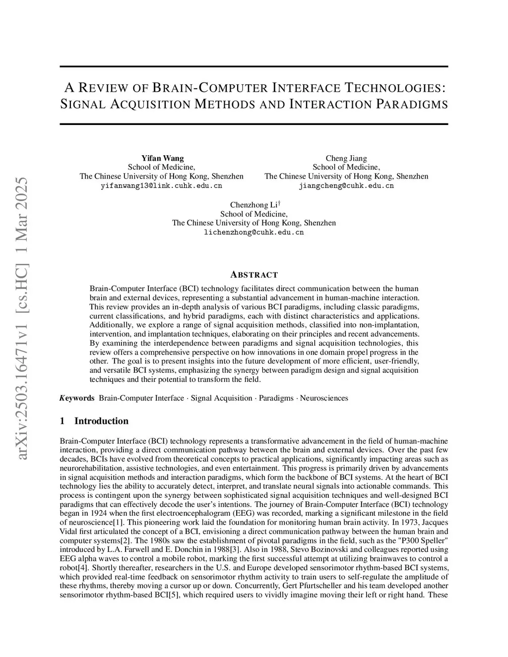 A Review of Brain-Computer Interface Technologies: Signal Acquisition Methods and Interaction Paradigms