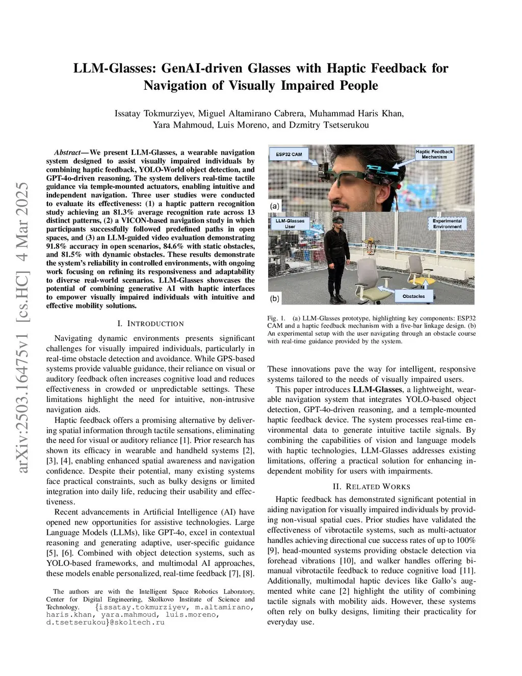 LLM-Glasses: GenAI-driven Glasses with Haptic Feedback for Navigation of Visually Impaired People
