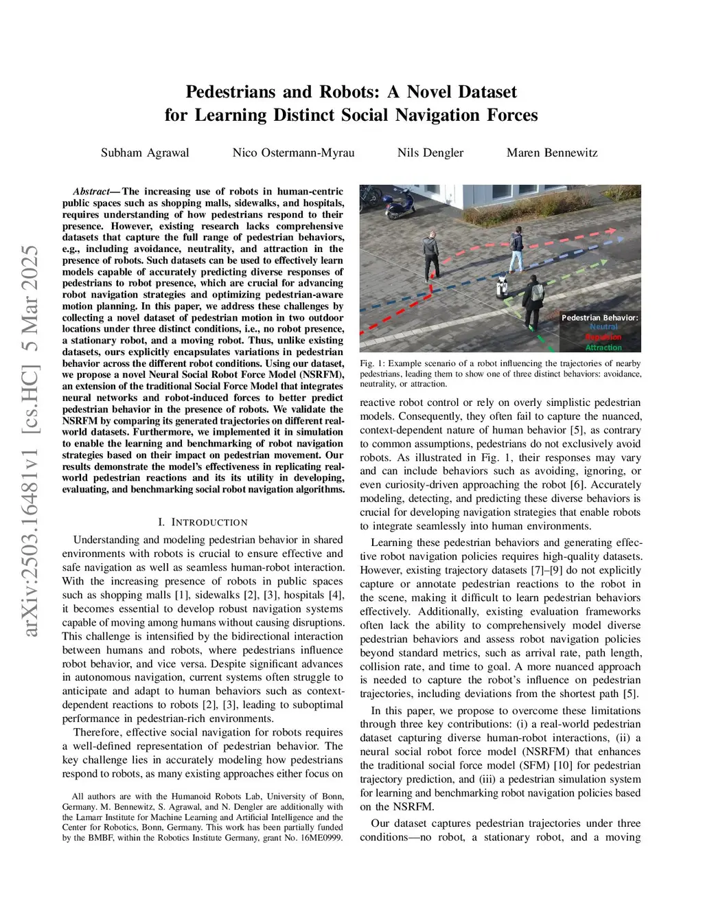 Robots are increasingly being deployed in public spaces such as shopping malls, sidewalks, and hospitals, where safe and socially aware navigation depends on anticipating how pedestrians respond to their presence. However, existing datasets rarely capture the full spectrum of robot-induced reactions, e.g., avoidance, neutrality, attraction, which limits progress in modeling these interactions. In this paper, we present the Pedestrian-Robot Interaction~(PeRoI) dataset that captures pedestrian motions categorized into attraction, neutrality, and repulsion across two outdoor sites under three controlled conditions: no robot present, with stationary robot, and with moving robot. This design explicitly reveals how pedestrian behavior varies across robot contexts, and we provide qualitative and quantitative comparisons to established state-of-the-art datasets. Building on these data, we propose the Neural Robot Social Force Model~(NeuRoSFM), an extension of the Social Force Model that integrates neural networks to augment inter-human dynamics with learned components and explicit robot-induced forces to better predict pedestrian motion in vicinity of robots. We evaluate NeuRoSFM by generating trajectories on multiple real-world datasets. The results demonstrate improved modeling of pedestrian-robot interactions, leading to better prediction accuracy, and highlight the value of our dataset and method for advancing socially aware navigation strategies in human-centered environments.