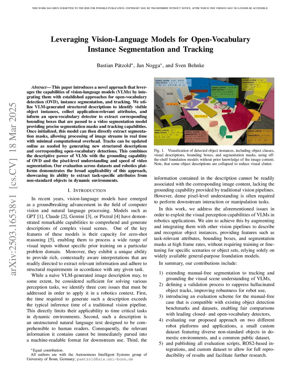 Vision-language models (VLMs) excel in visual understanding but often lack reliable grounding capabilities and actionable inference rates. Integrating them with open-vocabulary object detection (OVD), instance segmentation, and tracking leverages their strengths while mitigating these drawbacks. We utilize VLM-generated structured descriptions to identify visible object instances, collect application-relevant attributes, and inform an open-vocabulary detector to extract corresponding bounding boxes that are passed to a video segmentation model providing segmentation masks and tracking. Once initialized, this model directly extracts segmentation masks, processing image streams in real time with minimal computational overhead. Tracks can be updated online as needed by generating new structured descriptions and detections. This combines the descriptive power of VLMs with the grounding capability of OVD and the pixel-level understanding and speed of video segmentation. Our evaluation across datasets and robotics platforms demonstrates the broad applicability of this approach, showcasing its ability to extract task-specific attributes from non-standard objects in dynamic environments. Code, data, videos, and benchmarks are available atthis https URL