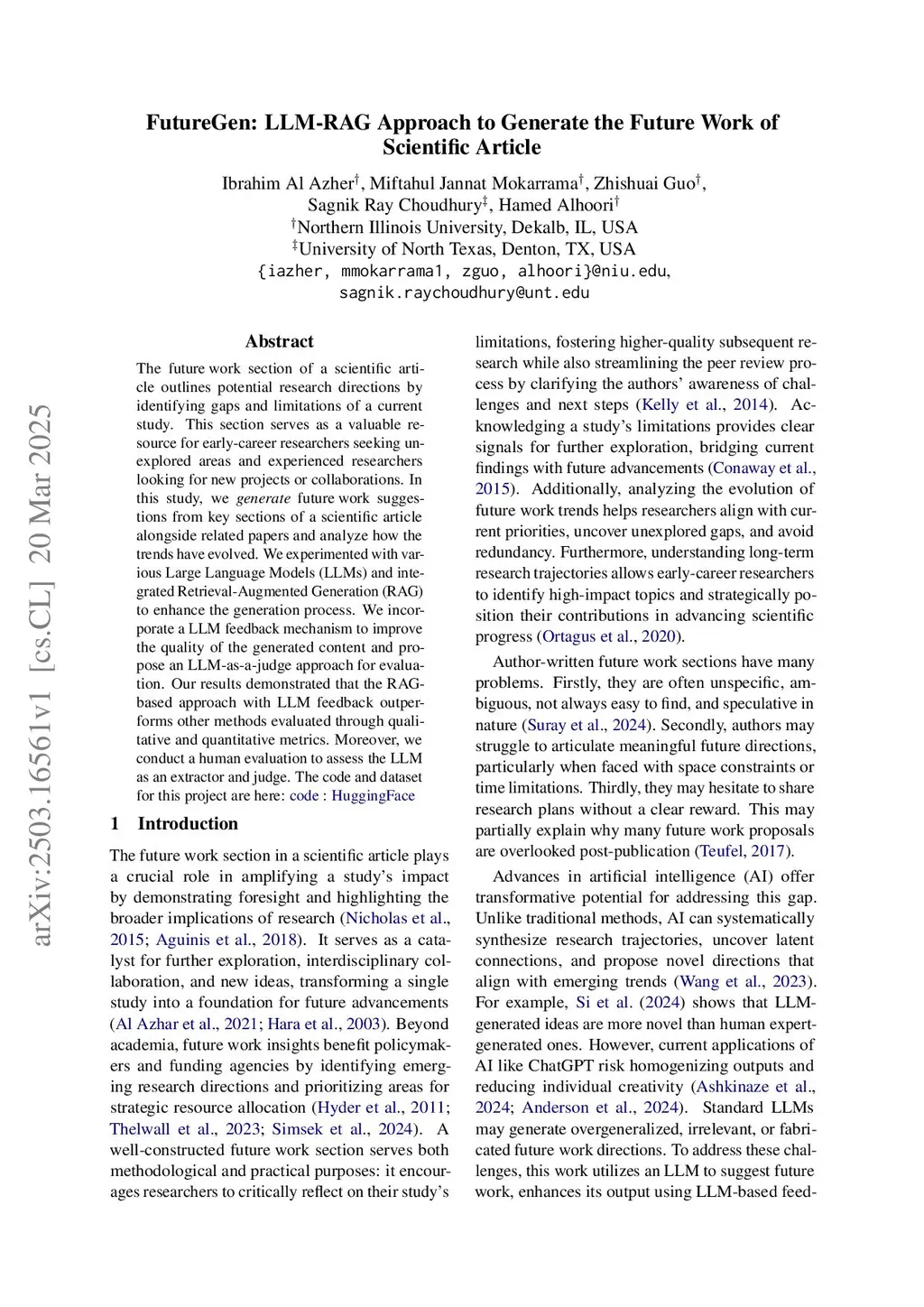 The Future Work section of a scientific article outlines potential research directions by identifying gaps and limitations of a current study. This section serves as a valuable resource for early-career researchers seeking unexplored areas and experienced researchers looking for new projects or collaborations. In this study, we generate future work suggestions from a scientific article. To enrich the generation process with broader insights and reduce the chance of missing important research directions, we use context from related papers using RAG. We experimented with various Large Language Models (LLMs) integrated into Retrieval-Augmented Generation (RAG). We incorporate an LLM feedback mechanism to enhance the quality of the generated content and introduce an LLM-as-a-judge framework for robust evaluation, assessing key aspects such as novelty, hallucination, and feasibility. Our results demonstrate that the RAG-based approach using GPT-4o mini, combined with an LLM feedback mechanism, outperforms other methods based on both qualitative and quantitative evaluations. Moreover, we conduct a human evaluation to assess the LLM as an extractor, generator, and feedback provider.