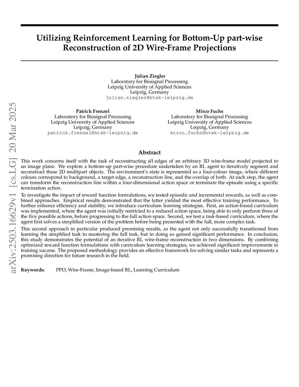 This work concerns itself with the task of reconstructing all edges of an arbitrary 3D wire-frame model projected to an image plane. We explore a bottom-up part-wise procedure undertaken by an RL agent to segment and reconstruct these 2D multipart objects. The environment's state is represented as a four-colour image, where different colours correspond to background, a target edge, a reconstruction line, and the overlap of both. At each step, the agent can transform the reconstruction line within a four-dimensional action space or terminate the episode using a specific termination action. To investigate the impact of reward function formulations, we tested episodic and incremental rewards, as well as combined approaches. Empirical results demonstrated that the latter yielded the most effective training performance. To further enhance efficiency and stability, we introduce curriculum learning strategies. First, an action-based curriculum was implemented, where the agent was initially restricted to a reduced action space, being able to only perform three of the five possible actions, before progressing to the full action space. Second, we test a task-based curriculum, where the agent first solves a simplified version of the problem before being presented with the full, more complex task. This second approach produced promising results, as the agent not only successfully transitioned from learning the simplified task to mastering the full task, but in doing so gained significant performance. This study demonstrates the potential of an iterative RL wire-frame reconstruction in two dimensions. By combining optimized reward function formulations with curriculum learning strategies, we achieved significant improvements in training success. The proposed methodology provides an effective framework for solving similar tasks and represents a promising direction for future research in the field.
