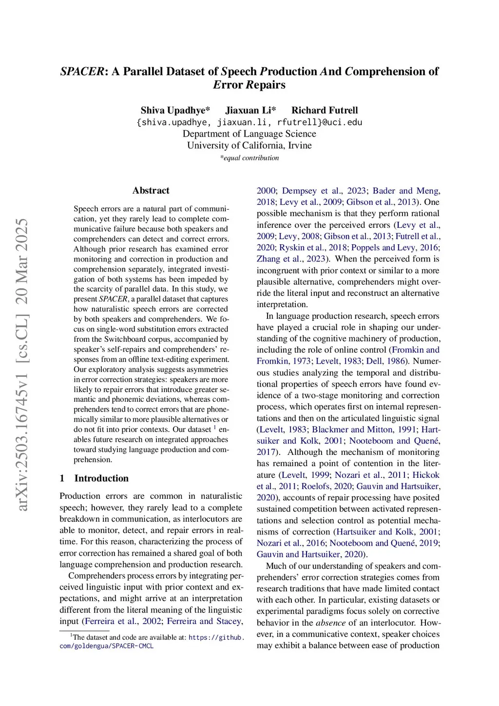 SPACER: A Parallel Dataset of Speech Production And Comprehension of Error Repairs