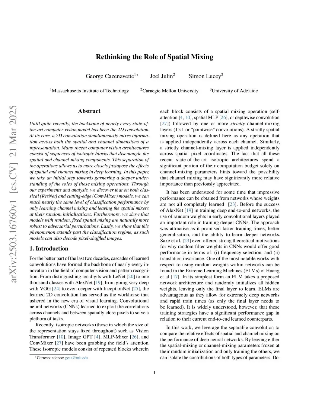 Until quite recently, the backbone of nearly every state-of-the-art computer vision model has been the 2D convolution. At its core, a 2D convolution simultaneously mixes information across both the spatial and channel dimensions of a representation. Many recent computer vision architectures consist of sequences of isotropic blocks that disentangle the spatial and channel-mixing components. This separation of the operations allows us to more closely juxtapose the effects of spatial and channel mixing in deep learning. In this paper, we take an initial step towards garnering a deeper understanding of the roles of these mixing operations. Through our experiments and analysis, we discover that on both classical (ResNet) and cutting-edge (ConvMixer) models, we can reach nearly the same level of classification performance by and leaving the spatial mixers at their random initializations. Furthermore, we show that models with random, fixed spatial mixing are naturally more robust to adversarial perturbations. Lastly, we show that this phenomenon extends past the classification regime, as such models can also decode pixel-shuffled images.