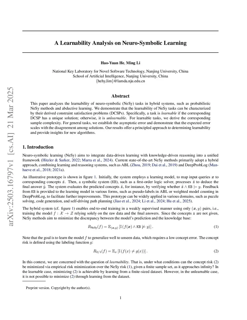 This paper analyzes the learnability of neuro-symbolic (NeSy) tasks within hybrid systems. We show that the learnability of NeSy tasks can be characterized by their derived constraint satisfaction problems (DCSPs). Specifically, a task is learnable if the corresponding DCSP has a unique solution; otherwise, it is unlearnable. For learnable tasks, we establish error bounds by exploiting the clustering property of the hypothesis space. Additionally, we analyze the asymptotic error for general NeSy tasks, showing that the expected error scales with the disagreement among solutions. Our results offer a principled approach to determining learnability and provide insights into the design of new algorithms.
