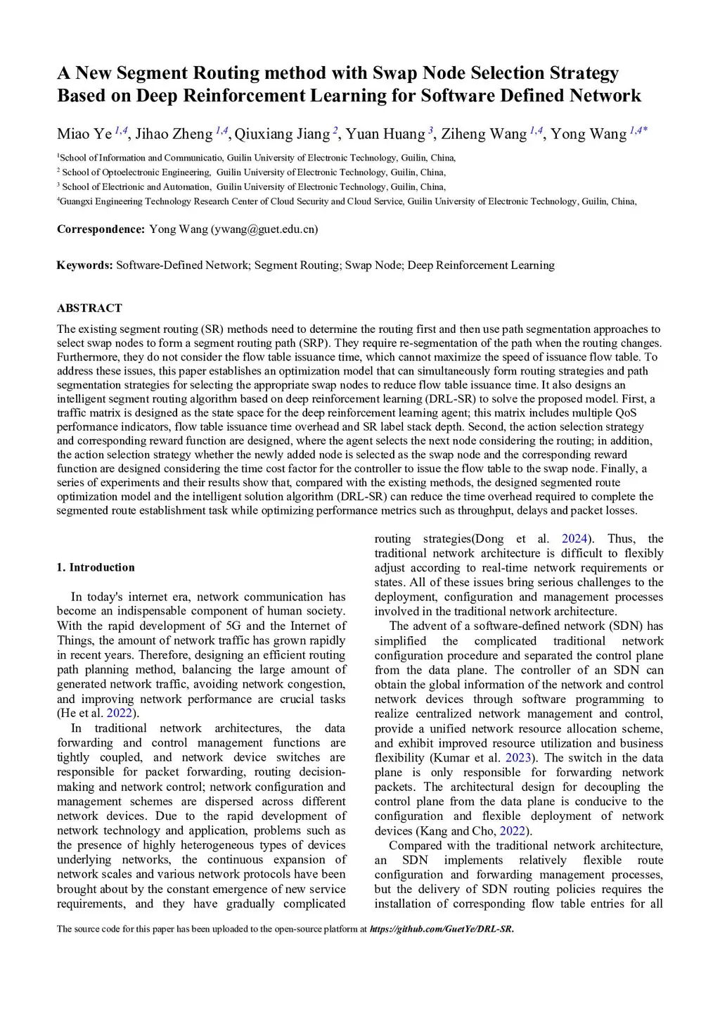 A New Segment Routing method with Swap Node Selection Strategy Based on Deep Reinforcement Learning for Software Defined Network