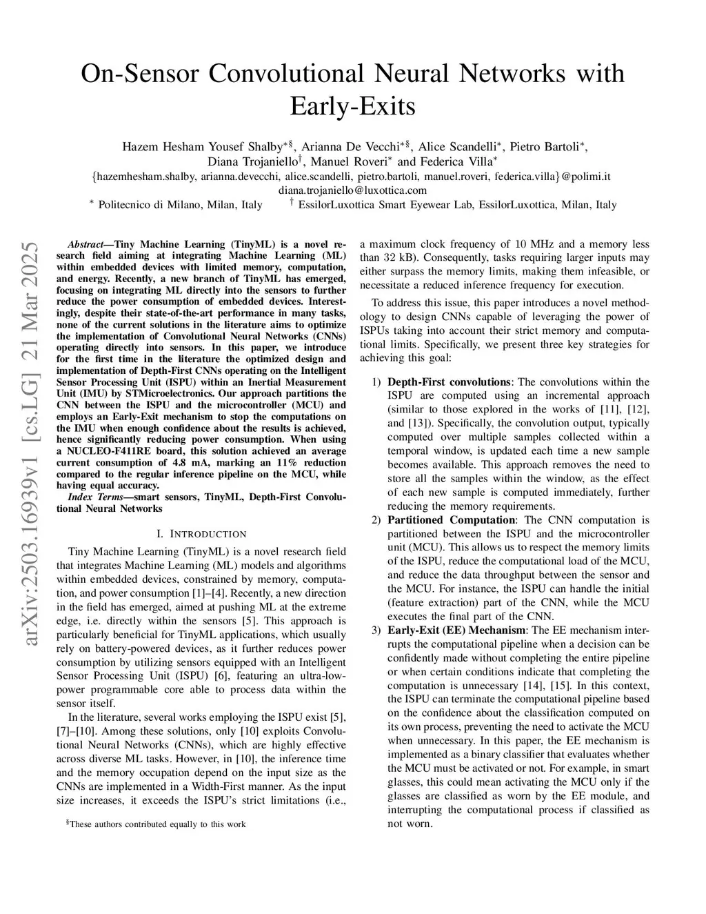 Tiny Machine Learning (TinyML) is a novel research field aiming at integrating Machine Learning (ML) within embedded devices with limited memory, computation, and energy. Recently, a new branch of TinyML has emerged, focusing on integrating ML directly into the sensors to further reduce the power consumption of embedded devices. Interestingly, despite their state-of-the-art performance in many tasks, none of the current solutions in the literature aims to optimize the implementation of Convolutional Neural Networks (CNNs) operating directly into sensors. In this paper, we introduce for the first time in the literature the optimized design and implementation of Depth-First CNNs operating on the Intelligent Sensor Processing Unit (ISPU) within an Inertial Measurement Unit (IMU) by STMicroelectronics. Our approach partitions the CNN between the ISPU and the microcontroller (MCU) and employs an Early-Exit mechanism to stop the computations on the IMU when enough confidence about the results is achieved, hence significantly reducing power consumption. When using a NUCLEO-F411RE board, this solution achieved an average current consumption of 4.8 mA, marking an 11% reduction compared to the regular inference pipeline on the MCU, while having equal accuracy.