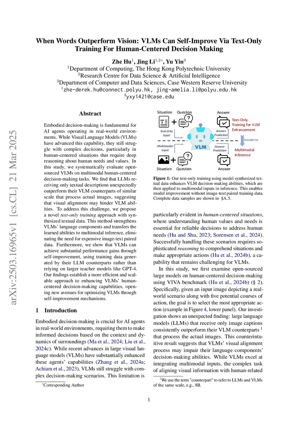Vision Language Models exhibit impressive performance for various tasks, yet they often lack the sophisticated situational reasoning required for complex decision-making. This paper shows that VLMs can achieve surprisingly strong decision-making performance when visual scenes are replaced by textual descriptions, suggesting foundational reasoning can be effectively learned from language. Motivated by this insight, we propose Praxis-VLM, a reasoning VLM for vision-grounded decision-making. Praxis-VLM employs the GRPO algorithm on textual scenarios to instill robust reasoning capabilities, where models learn to evaluate actions and their consequences. These reasoning skills, acquired purely from text, successfully transfer to multimodal inference with visual inputs, significantly reducing reliance on scarce paired image-text training data. Experiments across diverse decision-making benchmarks demonstrate that Praxis-VLM substantially outperforms standard supervised fine-tuning, exhibiting superior performance and generalizability. Further analysis confirms that our models engage in explicit and effective reasoning, underpinning their enhanced performance and adaptability.