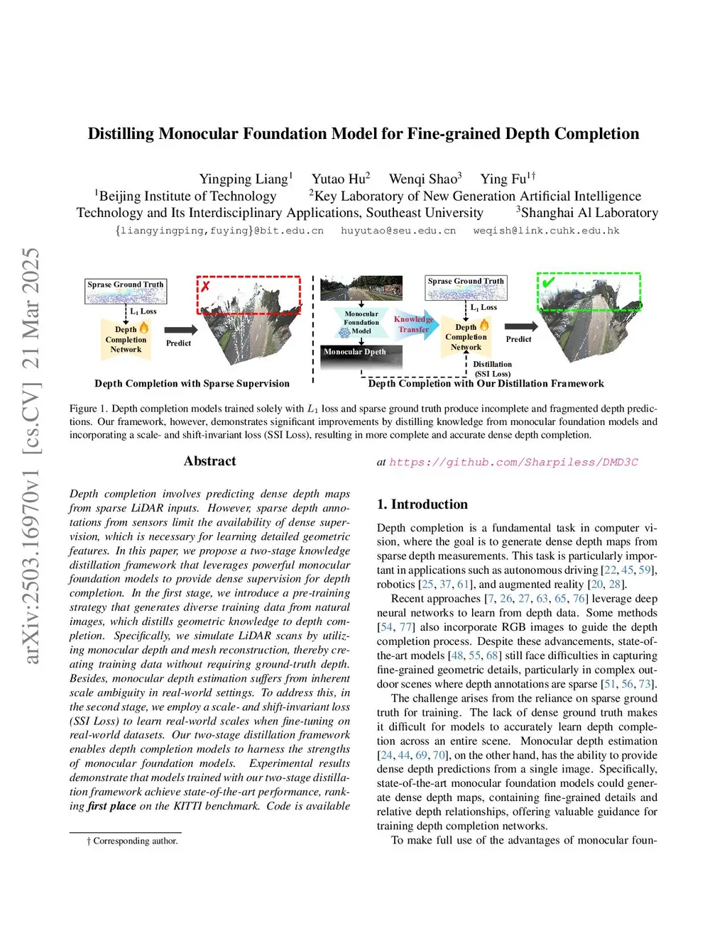 Depth completion involves predicting dense depth maps from sparse LiDAR inputs. However, sparse depth annotations from sensors limit the availability of dense supervision, which is necessary for learning detailed geometric features. In this paper, we propose a two-stage knowledge distillation framework that leverages powerful monocular foundation models to provide dense supervision for depth completion. In the first stage, we introduce a pre-training strategy that generates diverse training data from natural images, which distills geometric knowledge to depth completion. Specifically, we simulate LiDAR scans by utilizing monocular depth and mesh reconstruction, thereby creating training data without requiring ground-truth depth. Besides, monocular depth estimation suffers from inherent scale ambiguity in real-world settings. To address this, in the second stage, we employ a scale- and shift-invariant loss (SSI Loss) to learn real-world scales when fine-tuning on real-world datasets. Our two-stage distillation framework enables depth completion models to harness the strengths of monocular foundation models. Experimental results demonstrate that models trained with our two-stage distillation framework achieve state-of-the-art performance, ranking \textbf{first place} on the KITTI benchmark. Code is available atthis https URL