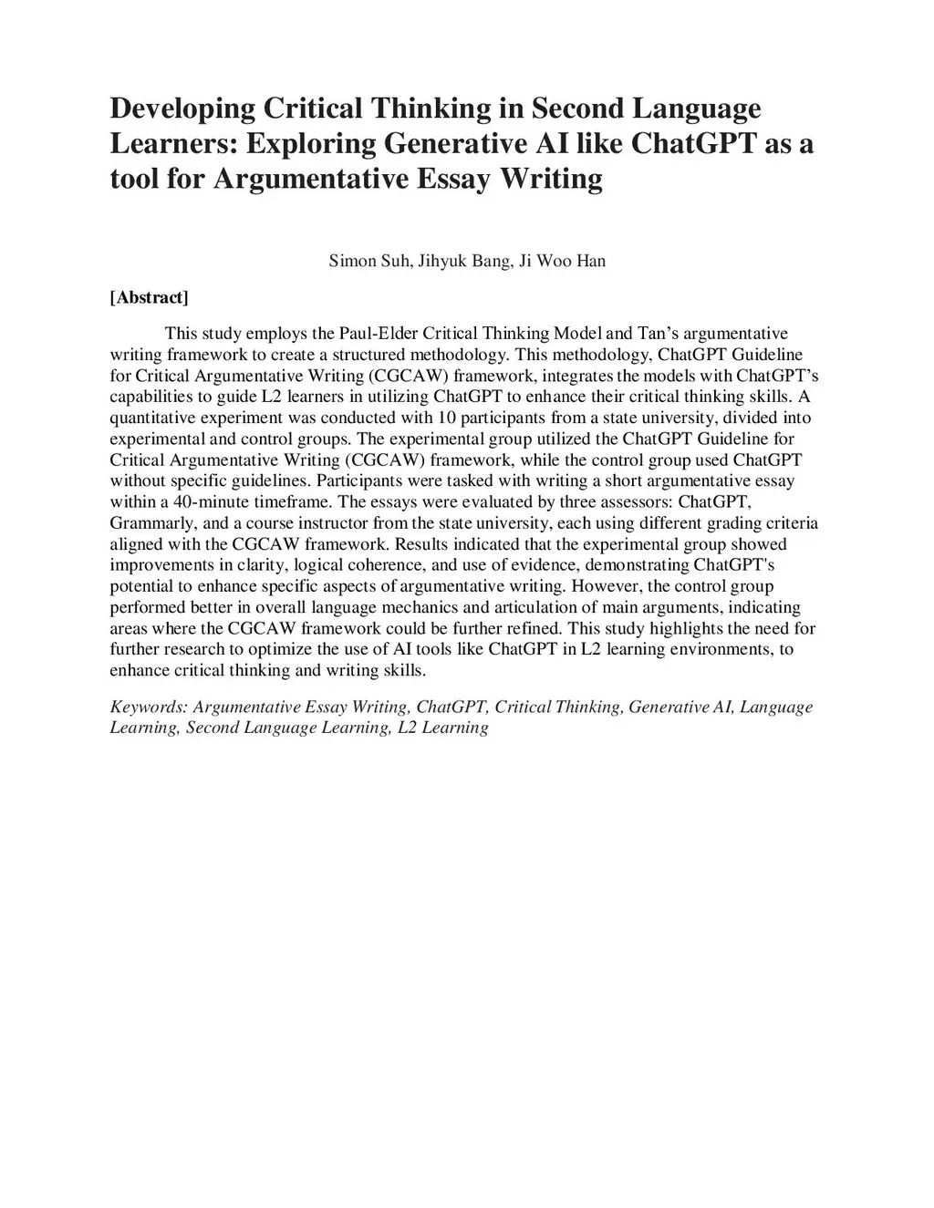 This study employs the Paul-Elder Critical Thinking Model and Tan's argumentative writing framework to create a structured methodology. This methodology, ChatGPT Guideline for Critical Argumentative Writing (CGCAW) framework, integrates the models with ChatGPT's capabilities to guide L2 learners in utilizing ChatGPT to enhance their critical thinking skills. A quantitative experiment was conducted with 10 participants from a state university, divided into experimental and control groups. The experimental group utilized the CGCAW framework, while the control group used ChatGPT without specific guidelines. Participants wrote an argumentative essay within a 40-minute timeframe, and essays were evaluated by three assessors: ChatGPT, Grammarly, and a course instructor. Results indicated that the experimental group showed improvements in clarity, logical coherence, and use of evidence, demonstrating ChatGPT's potential to enhance specific aspects of argumentative writing. However, the control group performed better in overall language mechanics and articulation of main arguments, indicating areas where the CGCAW framework could be further refined. This study highlights the need for further research to optimize the use of AI tools like ChatGPT in L2 learning environments to enhance critical thinking and writing skills.