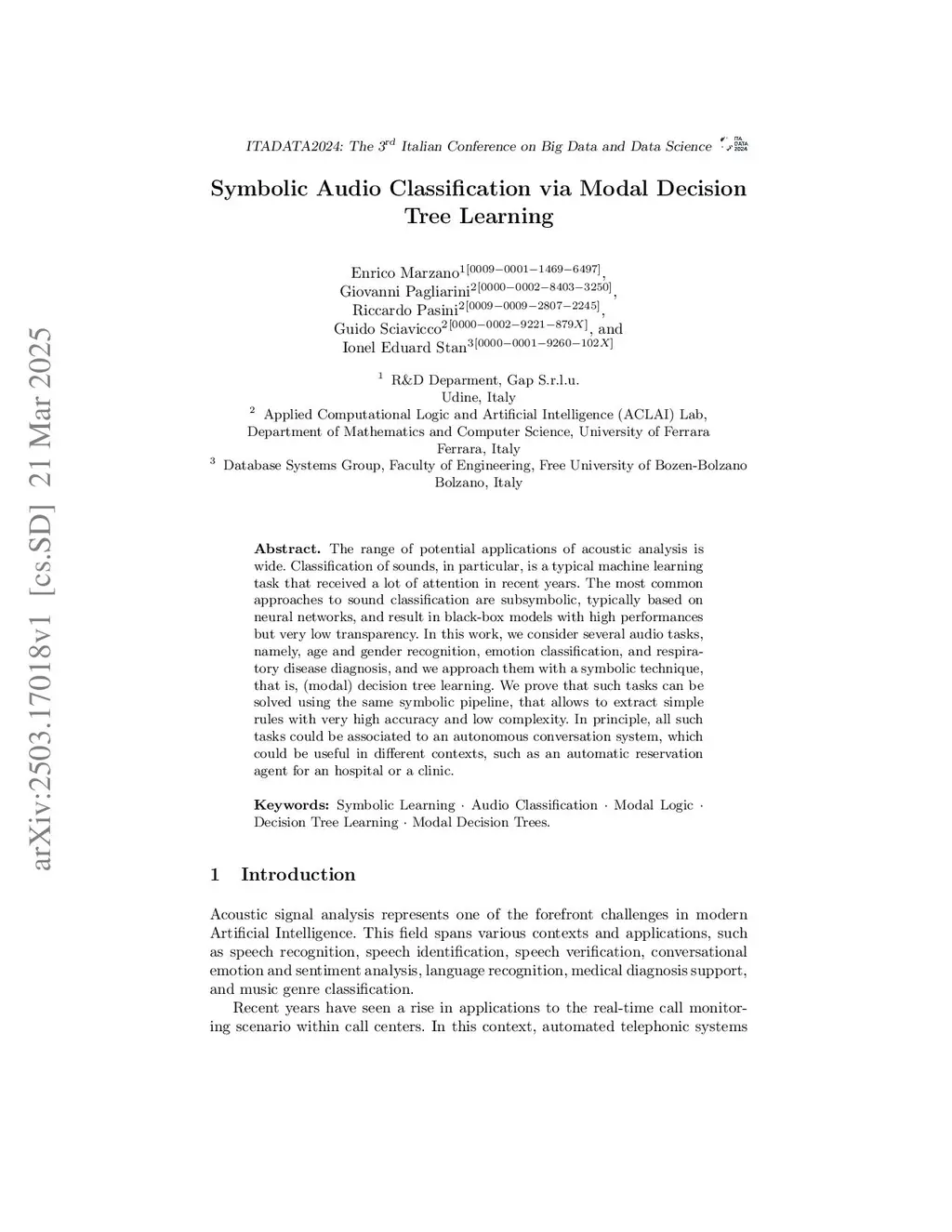 The range of potential applications of acoustic analysis is wide. Classification of sounds, in particular, is a typical machine learning task that received a lot of attention in recent years. The most common approaches to sound classification are sub-symbolic, typically based on neural networks, and result in black-box models with high performances but very low transparency. In this work, we consider several audio tasks, namely, age and gender recognition, emotion classification, and respiratory disease diagnosis, and we approach them with a symbolic technique, that is, (modal) decision tree learning. We prove that such tasks can be solved using the same symbolic pipeline, that allows to extract simple rules with very high accuracy and low complexity. In principle, all such tasks could be associated to an autonomous conversation system, which could be useful in different contexts, such as an automatic reservation agent for an hospital or a clinic.