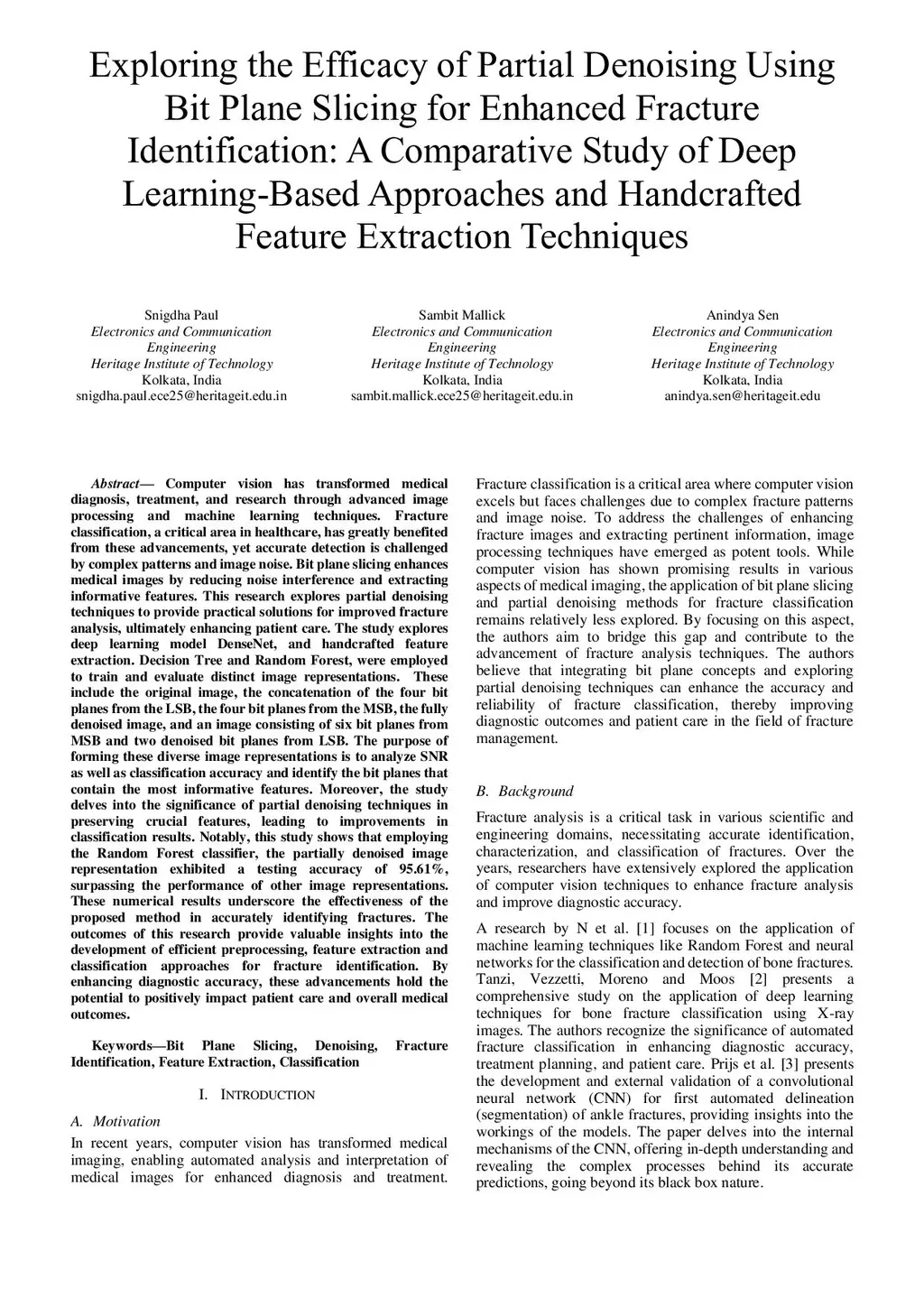 Computer vision has transformed medical diagnosis, treatment, and research through advanced image processing and machine learning techniques. Fracture classification, a critical area in healthcare, has greatly benefited from these advancements, yet accurate detection is challenged by complex patterns and image noise. Bit plane slicing enhances medical images by reducing noise interference and extracting informative features. This research explores partial denoising techniques to provide practical solutions for improved fracture analysis, ultimately enhancing patient care. The study explores deep learning model DenseNet and handcrafted feature extraction. Decision Tree and Random Forest, were employed to train and evaluate distinct image representations. These include the original image, the concatenation of the four bit planes from the LSB as well as MSB, the fully denoised image, and an image consisting of 6 bit planes from MSB and 2 denoised bit planes from LSB. The purpose of forming these diverse image representations is to analyze SNR as well as classification accuracy and identify the bit planes that contain the most informative features. Moreover, the study delves into the significance of partial denoising techniques in preserving crucial features, leading to improvements in classification results. Notably, this study shows that employing the Random Forest classifier, the partially denoised image representation exhibited a testing accuracy of 95.61% surpassing the performance of other image representations. The outcomes of this research provide valuable insights into the development of efficient preprocessing, feature extraction and classification approaches for fracture identification. By enhancing diagnostic accuracy, these advancements hold the potential to positively impact patient care and overall medical outcomes.