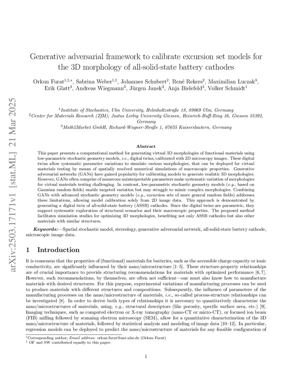 This paper presents a computational method for generating virtual 3D morphologies of functional materials using low-parametric stochastic geometry models, i.e., digital twins, calibrated with 2D microscopy images. These digital twins allow systematic parameter variations to simulate various morphologies, that can be deployed for virtual materials testing by means of spatially resolved numerical simulations of macroscopic properties. Generative adversarial networks (GANs) have gained popularity for calibrating models to generate realistic 3D morphologies. However, GANs often comprise of numerous uninterpretable parameters make systematic variation of morphologies for virtual materials testing challenging. In contrast, low-parametric stochastic geometry models (e.g., based on Gaussian random fields) enable targeted variation but may struggle to mimic complex morphologies. Combining GANs with advanced stochastic geometry models (e.g., excursion sets of more general random fields) addresses these limitations, allowing model calibration solely from 2D image data. This approach is demonstrated by generating a digital twin of all-solid-state battery (ASSB) cathodes. Since the digital twins are parametric, they support systematic exploration of structural scenarios and their macroscopic properties. The proposed method facilitates simulation studies for optimizing 3D morphologies, benefiting not only ASSB cathodes but also other materials with similar structures.