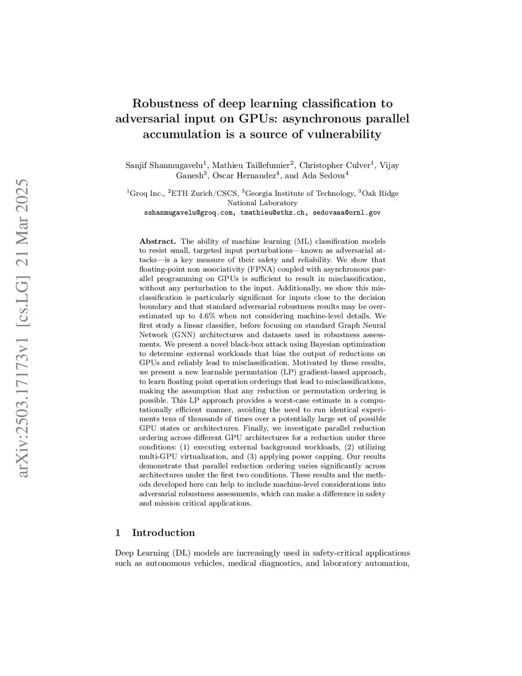 Robustness of deep learning classification to adversarial input on GPUs: asynchronous parallel accumulation is a source of vulnerability