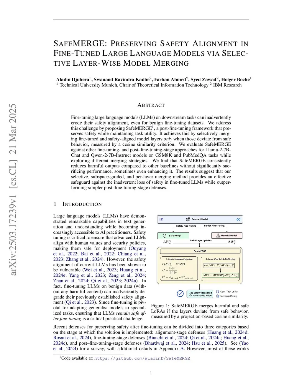 Fine-tuning large language models (LLMs) is a common practice to adapt generalist models to specialized domains. However, recent studies show that fine-tuning can erode safety alignment, causing LLMs to respond to harmful or unethical prompts. Many methods to realign safety have been proposed, but often introduce custom algorithms that are difficult to implement or compromise task utility. In this work, we propose SafeMERGE, a lightweight, post-fine-tuning framework that preserves safety while maintaining downstream performance. SafeMERGE selectively merges fine-tuned with safety-aligned model layers only when they deviate from safe behavior, measured by a cosine similarity criterion. Across three LLMs and two tasks, SafeMERGE consistently reduces harmful outputs compared to other defenses, with negligible or even positive impact on utility. Our results demonstrate that selective layer-wise merging offers an effective safeguard against the inadvertent loss of safety during fine-tuning, establishing SafeMERGE as a simple post-fine-tuning defense.