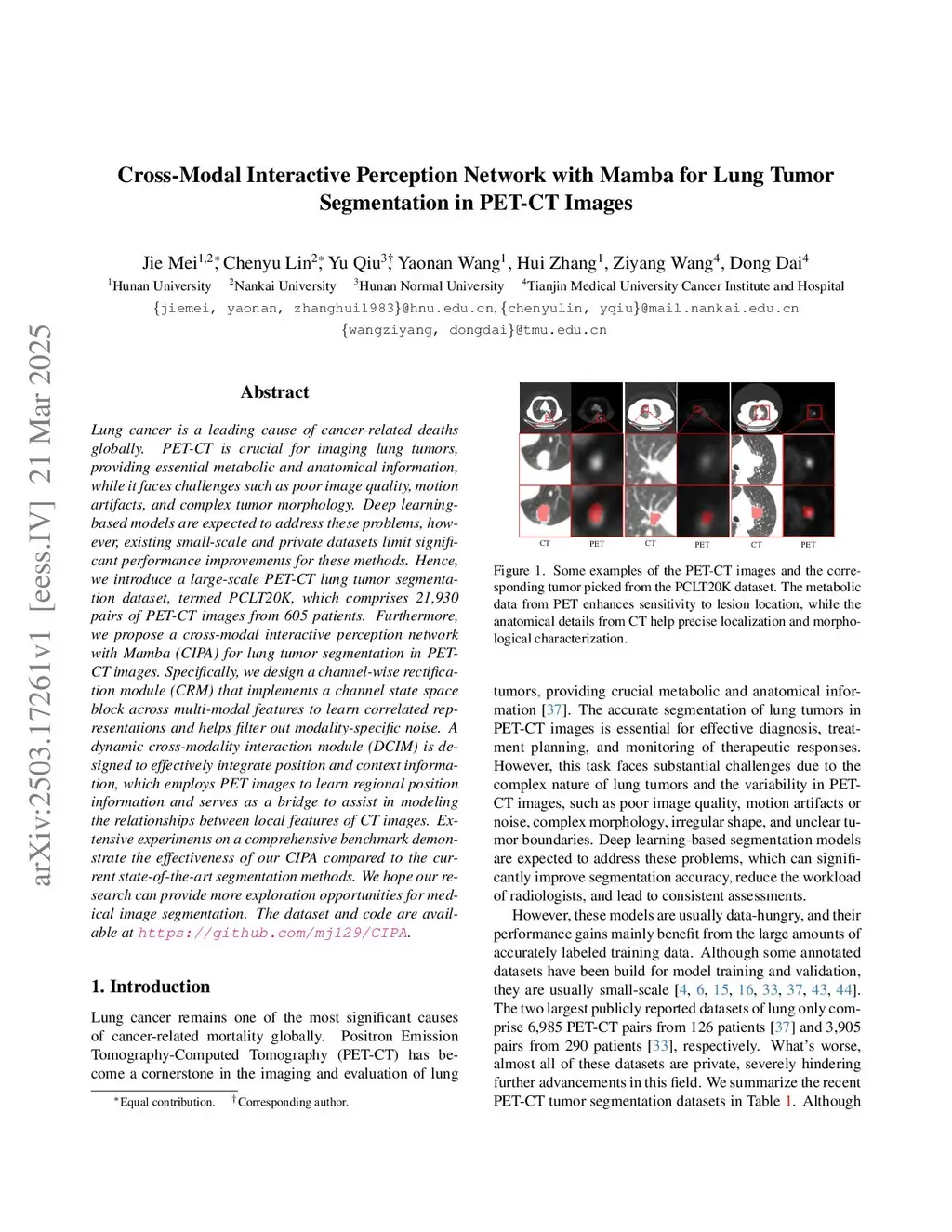 Lung cancer is a leading cause of cancer-related deaths globally. PET-CT is crucial for imaging lung tumors, providing essential metabolic and anatomical information, while it faces challenges such as poor image quality, motion artifacts, and complex tumor morphology. Deep learning-based models are expected to address these problems, however, existing small-scale and private datasets limit significant performance improvements for these methods. Hence, we introduce a large-scale PET-CT lung tumor segmentation dataset, termed PCLT20K, which comprises 21,930 pairs of PET-CT images from 605 patients. Furthermore, we propose a cross-modal interactive perception network with Mamba (CIPA) for lung tumor segmentation in PET-CT images. Specifically, we design a channel-wise rectification module (CRM) that implements a channel state space block across multi-modal features to learn correlated representations and helps filter out modality-specific noise. A dynamic cross-modality interaction module (DCIM) is designed to effectively integrate position and context information, which employs PET images to learn regional position information and serves as a bridge to assist in modeling the relationships between local features of CT images. Extensive experiments on a comprehensive benchmark demonstrate the effectiveness of our CIPA compared to the current state-of-the-art segmentation methods. We hope our research can provide more exploration opportunities for medical image segmentation. The dataset and code are available atthis https URL.