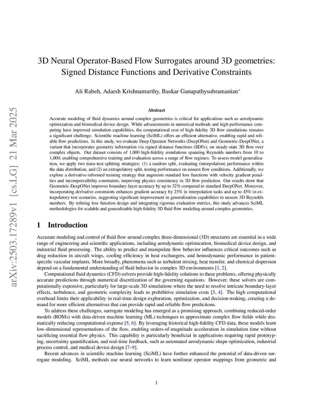 3D Neural Operator-Based Flow Surrogates around 3D geometries: Signed Distance Functions and Derivative Constraints