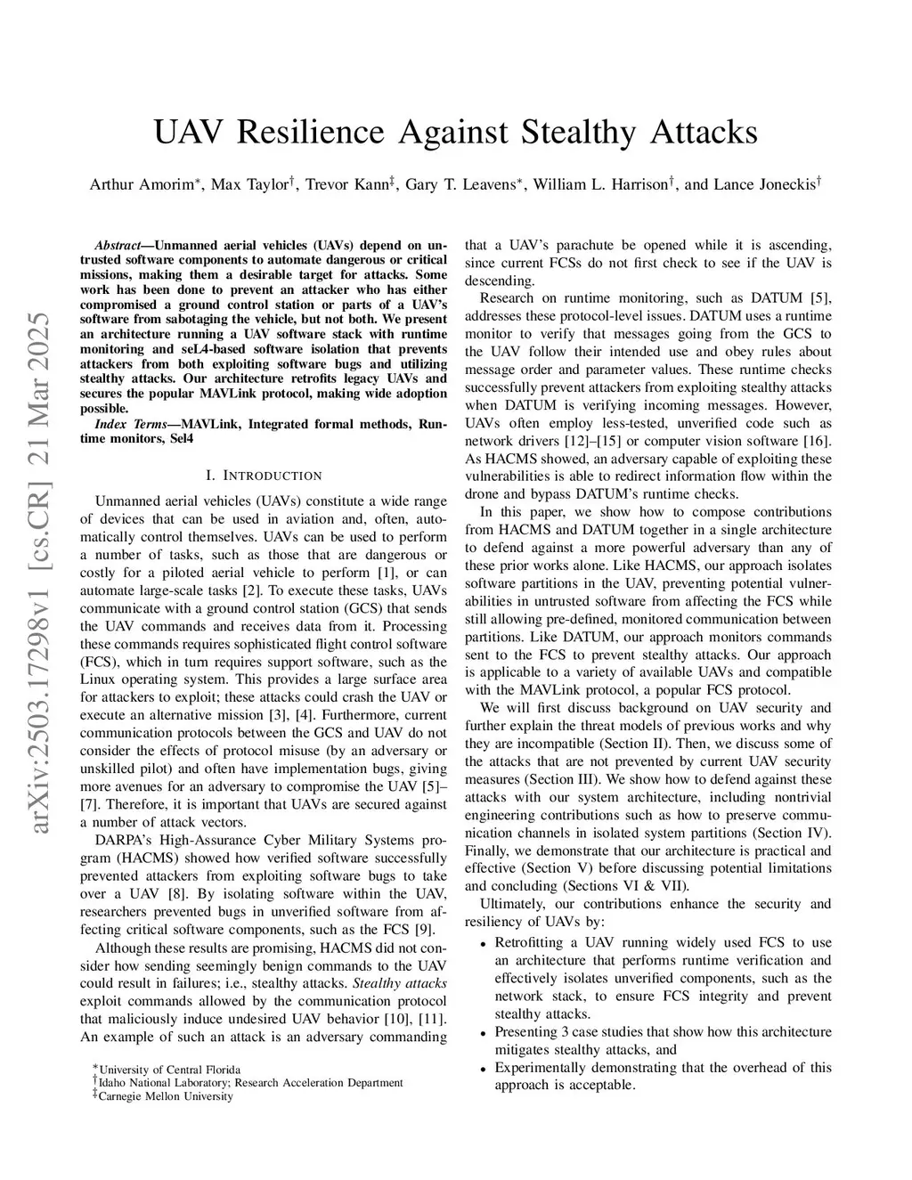 Unmanned aerial vehicles (UAVs) depend on untrusted software components to automate dangerous or critical missions, making them a desirable target for attacks. Some work has been done to prevent an attacker who has either compromised a ground control station or parts of a UAV's software from sabotaging the vehicle, but not both. We present an architecture running a UAV software stack with runtime monitoring and seL4-based software isolation that prevents attackers from both exploiting software bugs and stealthy attacks. Our architecture retrofits legacy UAVs and secures the popular MAVLink protocol, making wide adoption possible.
