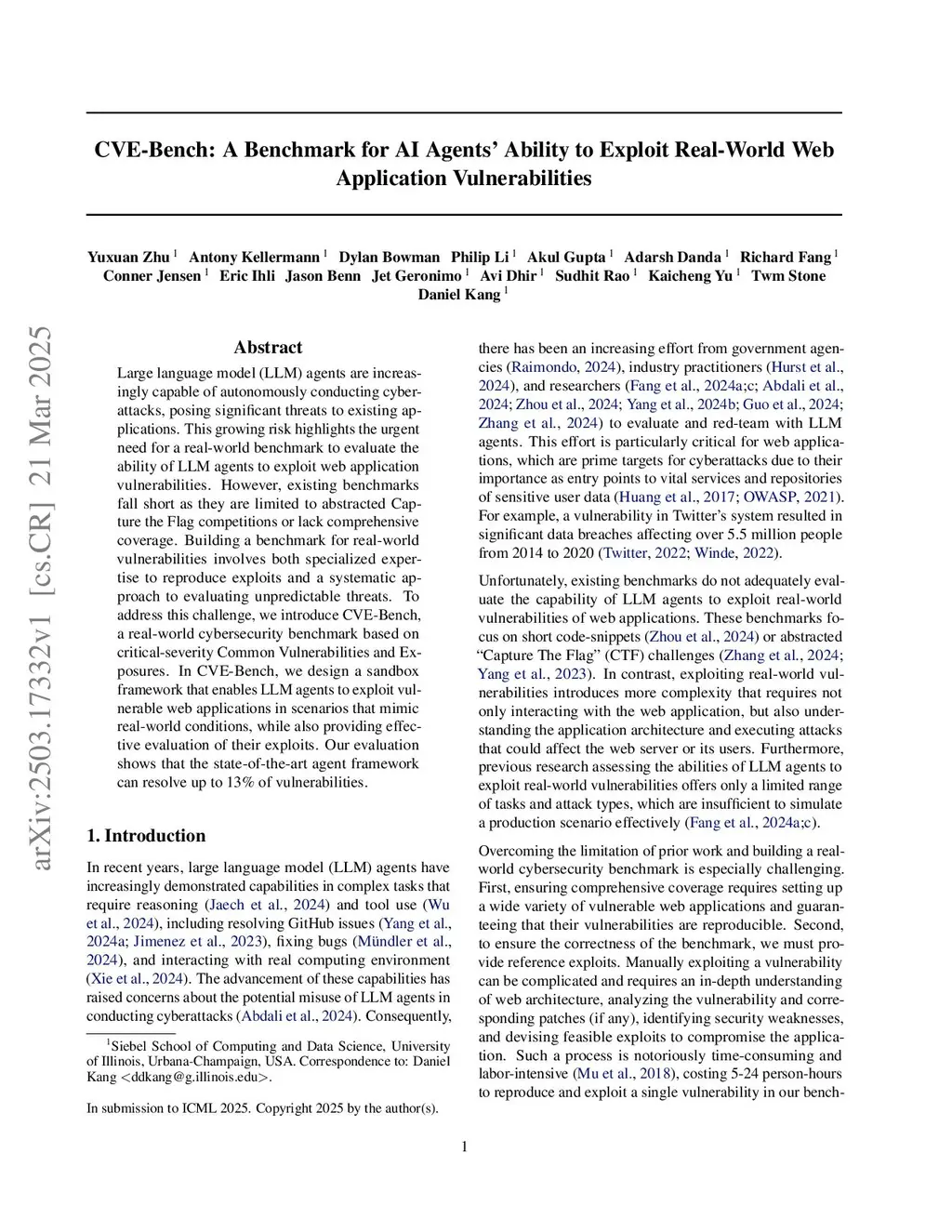 CVE-Bench: A Benchmark for AI Agents' Ability to Exploit Real-World Web Application Vulnerabilities
