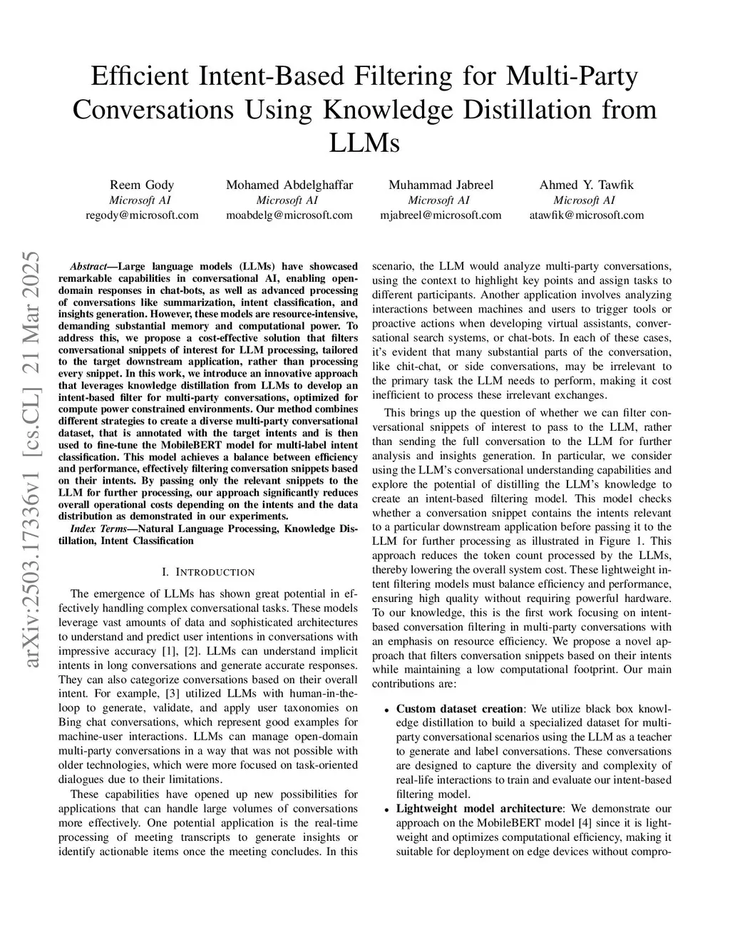 Large language models (LLMs) have showcased remarkable capabilities in conversational AI, enabling open-domain responses in chat-bots, as well as advanced processing of conversations like summarization, intent classification, and insights generation. However, these models are resource-intensive, demanding substantial memory and computational power. To address this, we propose a cost-effective solution that filters conversational snippets of interest for LLM processing, tailored to the target downstream application, rather than processing every snippet. In this work, we introduce an innovative approach that leverages knowledge distillation from LLMs to develop an intent-based filter for multi-party conversations, optimized for compute power constrained environments. Our method combines different strategies to create a diverse multi-party conversational dataset, that is annotated with the target intents and is then used to fine-tune the MobileBERT model for multi-label intent classification. This model achieves a balance between efficiency and performance, effectively filtering conversation snippets based on their intents. By passing only the relevant snippets to the LLM for further processing, our approach significantly reduces overall operational costs depending on the intents and the data distribution as demonstrated in our experiments.