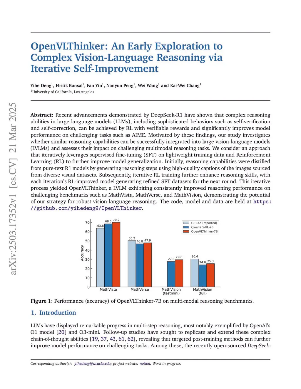 We introduce OpenVLThinker, one of the first open-source large vision-language models (LVLMs) to exhibit sophisticated chain-of-thought reasoning, achieving notable performance gains on challenging visual reasoning tasks. While text-based reasoning models (e.g., Deepseek R1) show promising results in text-only tasks, distilling their reasoning into LVLMs via supervised fine-tuning (SFT) often results in performance degradation due to imprecise visual grounding. Conversely, purely reinforcement learning (RL)-based methods face a large search space, hindering the emergence of reflective behaviors in smaller models (e.g., 7B LVLMs). Surprisingly, alternating between SFT and RL ultimately results in significant performance improvements after a few iterations. Our analysis reveals that the base model rarely exhibits reasoning behaviors initially, but SFT effectively surfaces these latent actions and narrows the RL search space, accelerating the development of reasoning capabilities. Each subsequent RL stage further refines the model's reasoning skills, producing higher-quality SFT data for continued self-improvement. OpenVLThinker-7B consistently advances performance across six benchmarks demanding mathematical and general reasoning, notably improving MathVista by 3.8%, EMMA by 2.4%, and HallusionBench by 1.6%. Beyond demonstrating the synergy between SFT and RL for complex reasoning tasks, our findings provide early evidence towards achieving R1-style reasoning in multimodal contexts. The code, model and data are held atthis https URL.