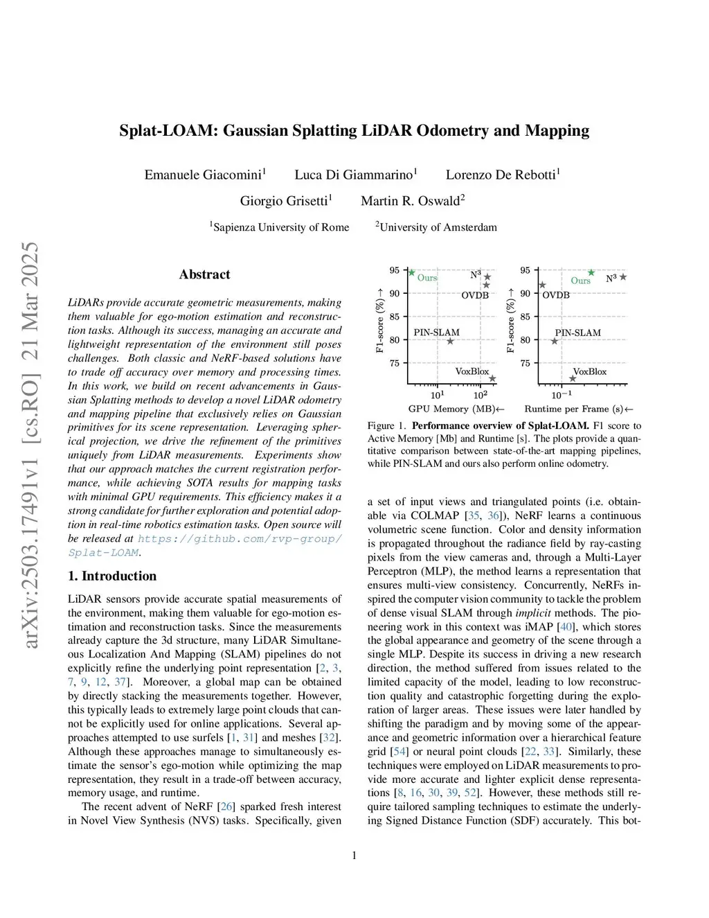 LiDARs provide accurate geometric measurements, making them valuable for ego-motion estimation and reconstruction tasks. Although its success, managing an accurate and lightweight representation of the environment still poses challenges. Both classic and NeRF-based solutions have to trade off accuracy over memory and processing times. In this work, we build on recent advancements in Gaussian Splatting methods to develop a novel LiDAR odometry and mapping pipeline that exclusively relies on Gaussian primitives for its scene representation. Leveraging spherical projection, we drive the refinement of the primitives uniquely from LiDAR measurements. Experiments show that our approach matches the current registration performance, while achieving SOTA results for mapping tasks with minimal GPU requirements. This efficiency makes it a strong candidate for further exploration and potential adoption in real-time robotics estimation tasks.