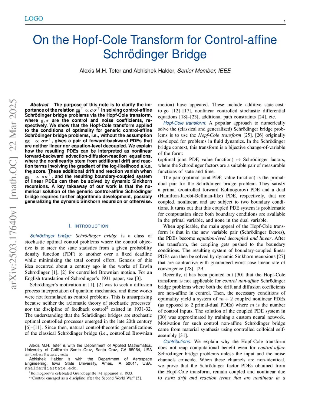 The purpose of this note is to clarify the importance of the relation in solving control-affine Schrödinger bridge problems via the Hopf-Cole transform, where are the control and noise coefficients, respectively. We show that the Hopf-Cole transform applied to the conditions of optimality for generic control-affine Schrödinger bridge problems, i.e., without the assumption , gives a pair of forward-backward PDEs that are neither linear nor equation-level decoupled. We explain how the resulting PDEs can be interpreted as nonlinear forward-backward advection-diffusion-reaction equations, where the nonlinearity stem from additional drift and reaction terms involving the gradient of the log-likelihood a.k.a. the score. These additional drift and reaction vanish when , and the resulting boundary-coupled system of linear PDEs can then be solved by dynamic Sinkhorn recursions. A key takeaway of our work is that the numerical solution of the generic control-affine Schrödinger bridge requires further algorithmic development, possibly generalizing the dynamic Sinkhorn recursion or otherwise.