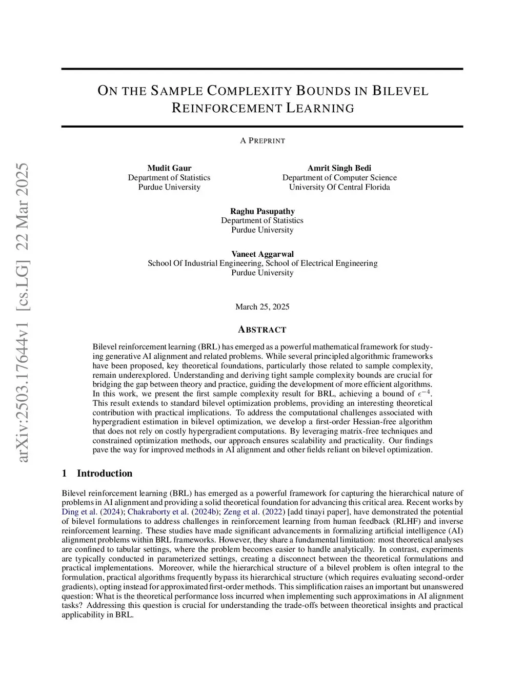 Bilevel reinforcement learning (BRL) has emerged as a powerful framework for aligning generative models, yet its theoretical foundations, especially sample complexity bounds, remain underexplored. In this work, we present the first sample complexity bound for BRL, establishing a rate of in continuous state-action spaces. Traditional MDP analysis techniques do not extend to BRL due to its nested structure and non-convex lower-level problems. We overcome these challenges by leveraging the Polyak-Łojasiewicz (PL) condition and the MDP structure to obtain closed-form gradients, enabling tight sample complexity analysis. Our analysis also extends to general bi-level optimization settings with non-convex lower levels, where we achieve state-of-the-art sample complexity results of improving upon existing bounds of . Additionally, we address the computational bottleneck of hypergradient estimation by proposing a fully first-order, Hessian-free algorithm suitable for large-scale problems.