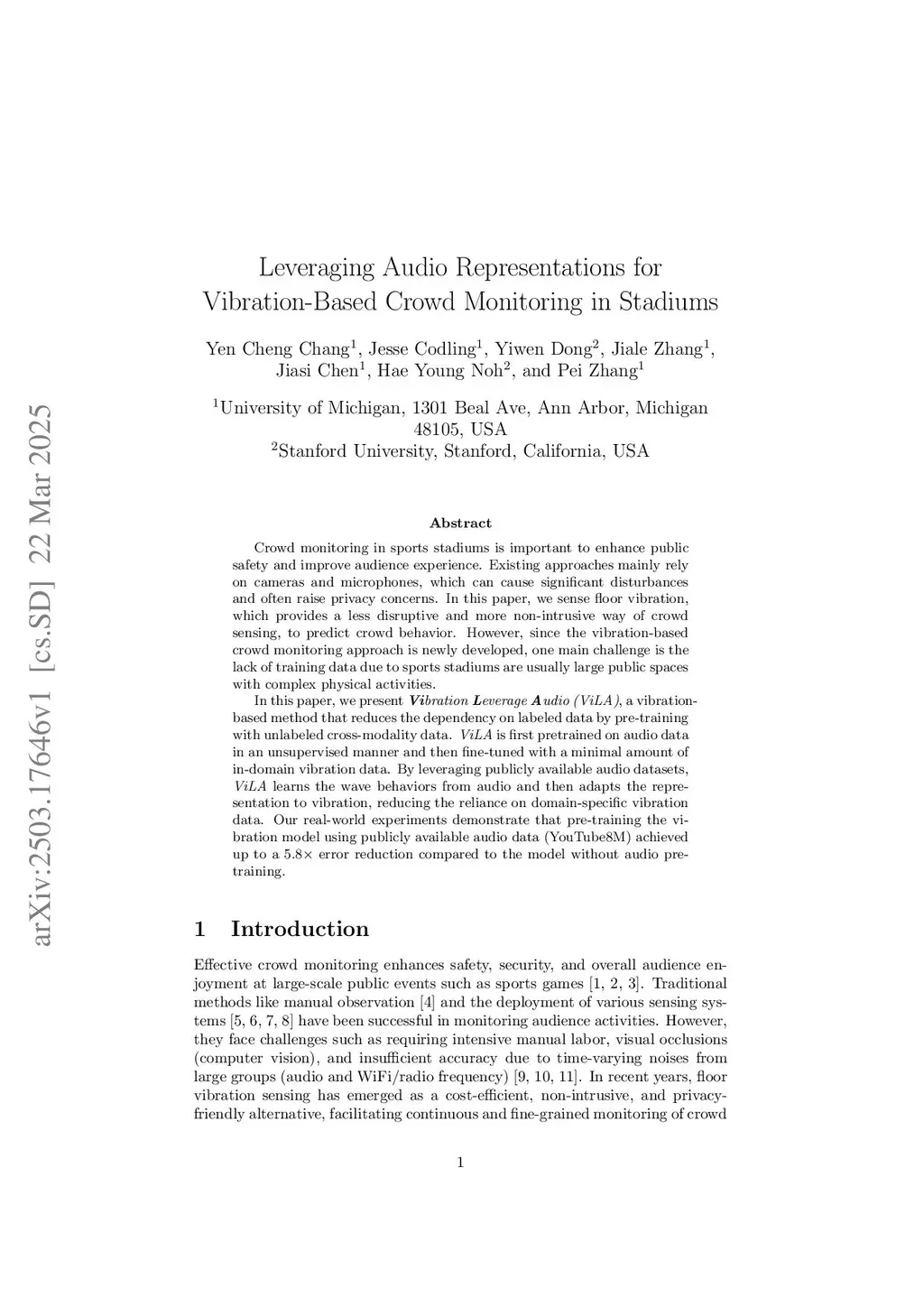 Crowd monitoring in sports stadiums is important to enhance public safety and improve the audience experience. Existing approaches mainly rely on cameras and microphones, which can cause significant disturbances and often raise privacy concerns. In this paper, we sense floor vibration, which provides a less disruptive and more non-intrusive way of crowd sensing, to predict crowd behavior. However, since the vibration-based crowd monitoring approach is newly developed, one main challenge is the lack of training data due to sports stadiums being large public spaces with complex physical activities.In this paper, we present ViLA (Vibration Leverage Audio), a vibration-based method that reduces the dependency on labeled data by pre-training with unlabeled cross-modality data. ViLA is first pre-trained on audio data in an unsupervised manner and then fine-tuned with a minimal amount of in-domain vibration data. By leveraging publicly available audio datasets, ViLA learns the wave behaviors from audio and then adapts the representation to vibration, reducing the reliance on domain-specific vibration data. Our real-world experiments demonstrate that pre-training the vibration model using publicly available audio data (YouTube8M) achieved up to a 5.8x error reduction compared to the model without audio pre-training.
