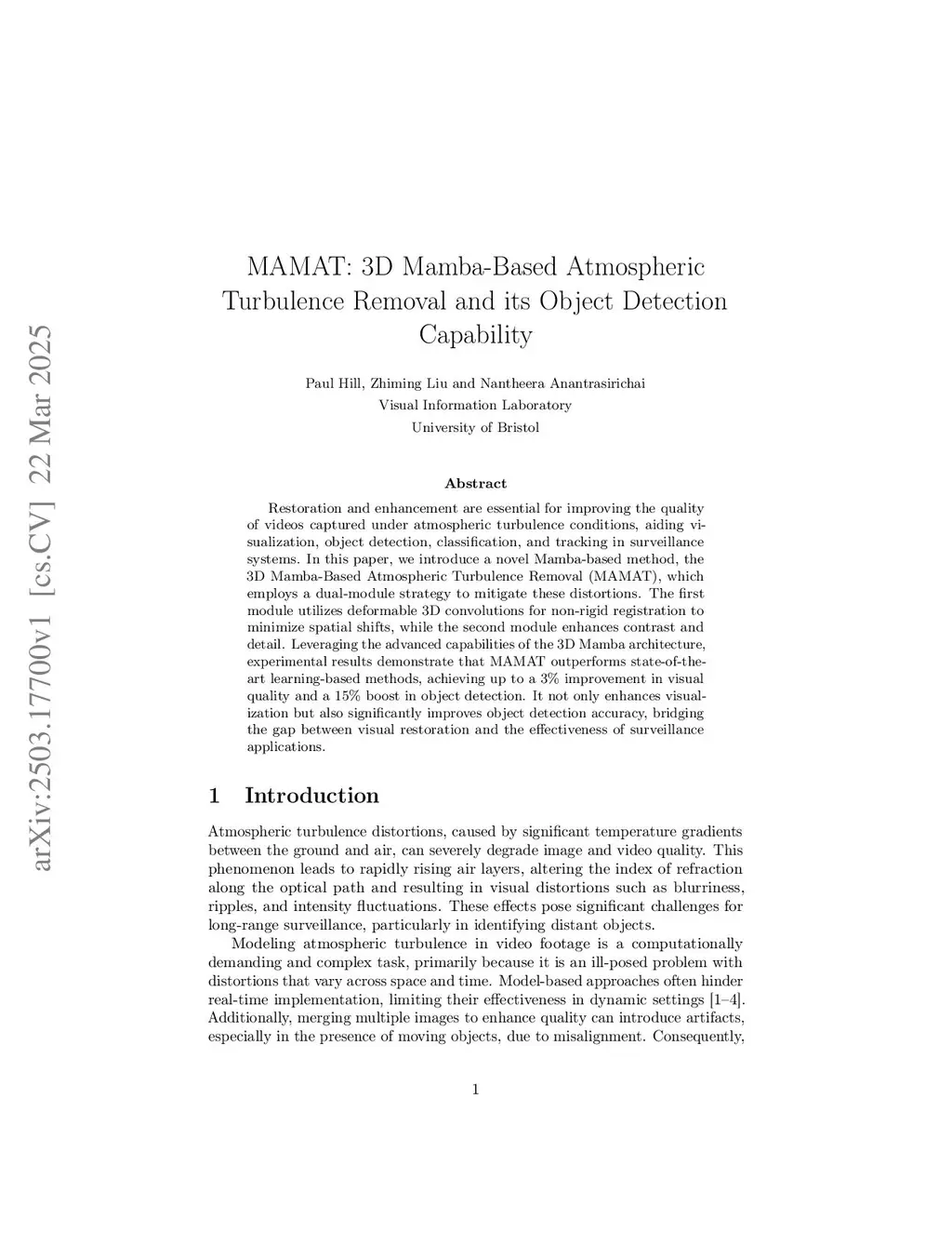 Restoration and enhancement are essential for improving the quality of videos captured under atmospheric turbulence conditions, aiding visualization, object detection, classification, and tracking in surveillance systems. In this paper, we introduce a novel Mamba-based method, the 3D Mamba-Based Atmospheric Turbulence Removal (MAMAT), which employs a dual-module strategy to mitigate these distortions. The first module utilizes deformable 3D convolutions for non-rigid registration to minimize spatial shifts, while the second module enhances contrast and detail. Leveraging the advanced capabilities of the 3D Mamba architecture, experimental results demonstrate that MAMAT outperforms state-of-the-art learning-based methods, achieving up to a 3\% improvement in visual quality and a 15\% boost in object detection. It not only enhances visualization but also significantly improves object detection accuracy, bridging the gap between visual restoration and the effectiveness of surveillance applications.