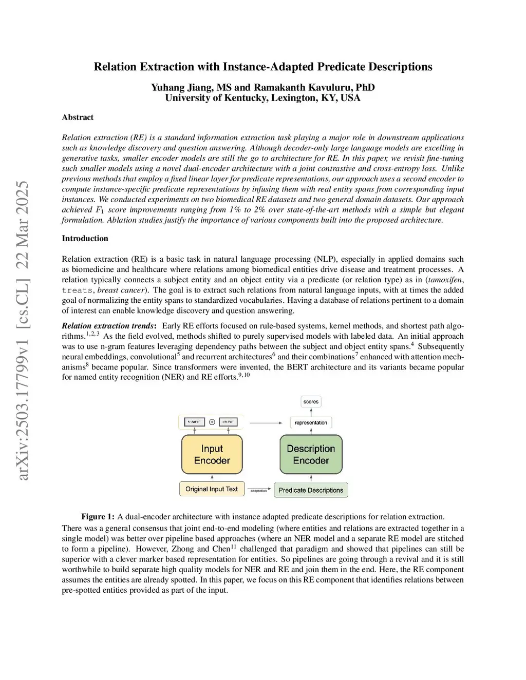 Relation extraction (RE) is a standard information extraction task playing a major role in downstream applications such as knowledge discovery and question answering. Although decoder-only large language models are excelling in generative tasks, smaller encoder models are still the go to architecture for RE. In this paper, we revisit fine-tuning such smaller models using a novel dual-encoder architecture with a joint contrastive and cross-entropy loss. Unlike previous methods that employ a fixed linear layer for predicate representations, our approach uses a second encoder to compute instance-specific predicate representations by infusing them with real entity spans from corresponding input instances. We conducted experiments on two biomedical RE datasets and two general domain datasets. Our approach achieved F1 score improvements ranging from 1% to 2% over state-of-the-art methods with a simple but elegant formulation. Ablation studies justify the importance of various components built into the proposed architecture.