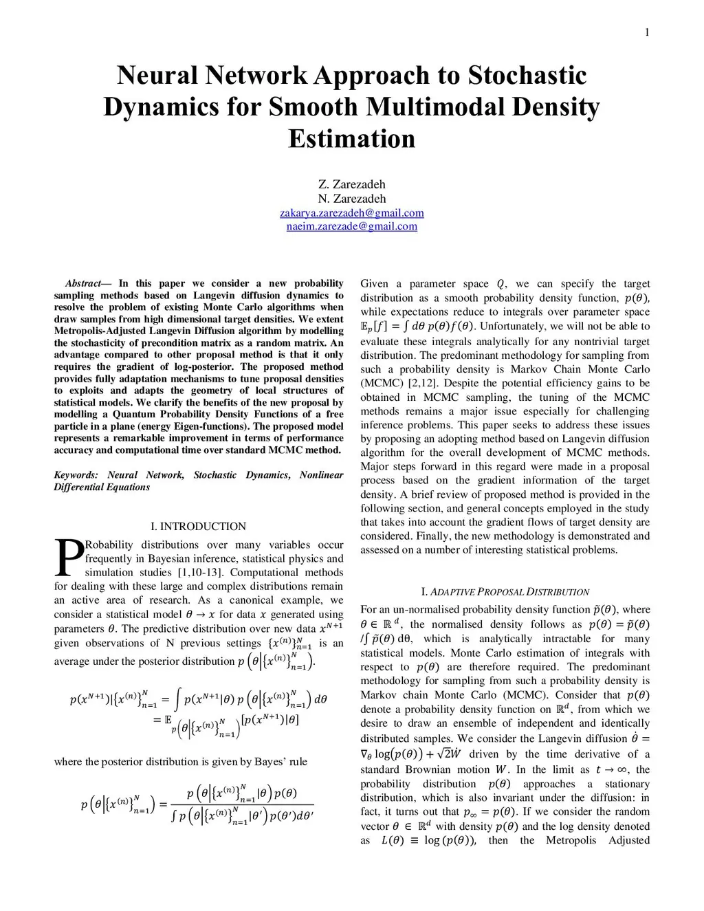 In this paper we consider a new probability sampling methods based on Langevin diffusion dynamics to resolve the problem of existing Monte Carlo algorithms when draw samples from high dimensional target densities. We extent Metropolis-Adjusted Langevin Diffusion algorithm by modelling the stochasticity of precondition matrix as a random matrix. An advantage compared to other proposal method is that it only requires the gradient of log-posterior. The proposed method provides fully adaptation mechanisms to tune proposal densities to exploits and adapts the geometry of local structures of statistical models. We clarify the benefits of the new proposal by modelling a Quantum Probability Density Functions of a free particle in a plane (energy Eigen-functions). The proposed model represents a remarkable improvement in terms of performance accuracy and computational time over standard MCMC method.