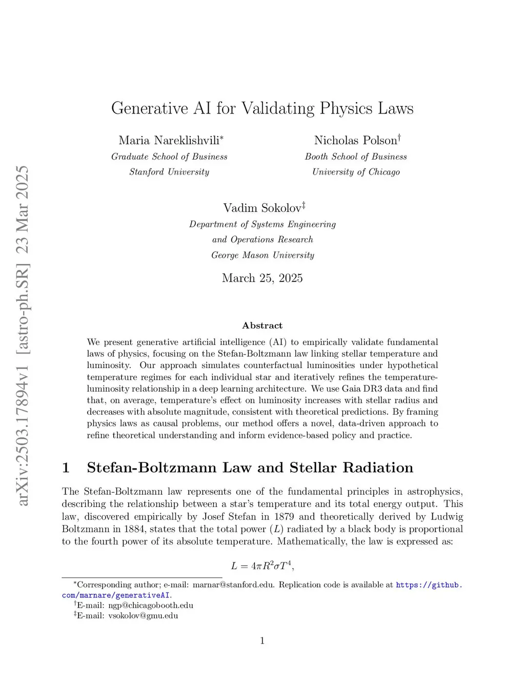 We present generative artificial intelligence (AI) to empirically validate fundamental laws of physics, focusing on the Stefan-Boltzmann law linking stellar temperature and luminosity. Our approach simulates counterfactual luminosities under hypothetical temperature regimes for each individual star and iteratively refines the temperature-luminosity relationship in a deep learning architecture. We use Gaia DR3 data and find that, on average, temperature's effect on luminosity increases with stellar radius and decreases with absolute magnitude, consistent with theoretical predictions. By framing physics laws as causal problems, our method offers a novel, data-driven approach to refine theoretical understanding and inform evidence-based policy and practice.