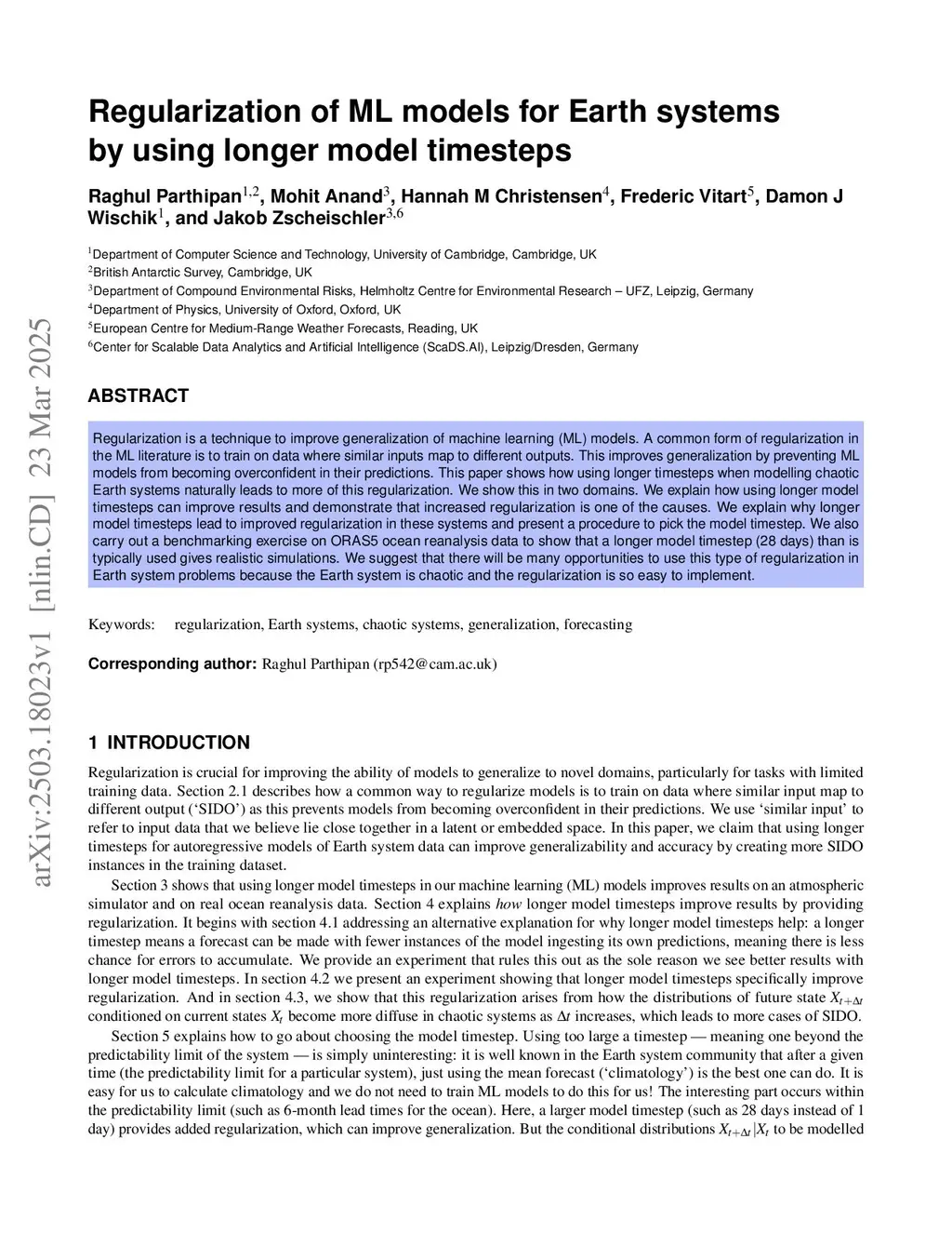 Regularization is a technique to improve generalization of machine learning (ML) models. A common form of regularization in the ML literature is to train on data where similar inputs map to different outputs. This improves generalization by preventing ML models from becoming overconfident in their predictions. This paper shows how using longer timesteps when modelling chaotic Earth systems naturally leads to more of this regularization. We show this in two domains. We explain how using longer model timesteps can improve results and demonstrate that increased regularization is one of the causes. We explain why longer model timesteps lead to improved regularization in these systems and present a procedure to pick the model timestep. We also carry out a benchmarking exercise on ORAS5 ocean reanalysis data to show that a longer model timestep (28 days) than is typically used gives realistic simulations. We suggest that there will be many opportunities to use this type of regularization in Earth system problems because the Earth system is chaotic and the regularization is so easy to implement.