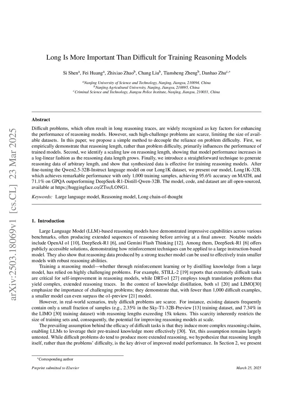 Difficult problems, which often result in long reasoning traces, are widely recognized as key factors for enhancing the performance of reasoning models. However, such high-challenge problems are scarce, limiting the size of available datasets. In this paper, we propose a simple method to decouple the reliance on problem difficulty. First, we empirically demonstrate that reasoning length, rather than problem difficulty, primarily influences the performance of trained models. Second, we identify a scaling law on reasoning length, showing that model performance increases in a log-linear fashion as the reasoning data length grows. Finally, we introduce a straightforward technique to generate reasoning data of arbitrary length, and show that synthesized data is effective for training reasoning models. After fine-tuning the Qwen2.5-32B-Instruct language model on our Long1K dataset, we present our model, Long1K-32B, which achieves remarkable performance with only 1,000 training samples, achieving 95.6\% accuracy on MATH, and 71.1\% on GPQA outperforming DeepSeek-R1-Distill-Qwen-32B. The model, code, and dataset are all open-sourced, available atthis https URL.