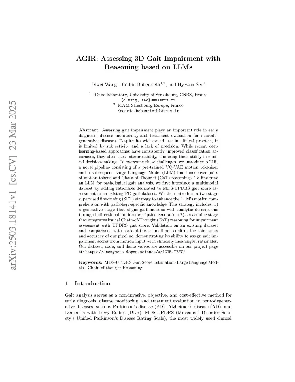 Assessing gait impairment plays an important role in early diagnosis, disease monitoring, and treatment evaluation for neurodegenerative diseases. Despite its widespread use in clinical practice, it is limited by subjectivity and a lack of precision. While recent deep learning-based approaches have consistently improved classification accuracies, they often lack interpretability, hindering their utility in clinical decision-making. To overcome these challenges, we introduce AGIR, a novel pipeline consisting of a pre-trained VQ-VAE motion tokenizer and a subsequent Large Language Model (LLM) fine-tuned over pairs of motion tokens and Chain-of-Thought (CoT) reasonings. To fine-tune an LLM for pathological gait analysis, we first introduce a multimodal dataset by adding rationales dedicated to MDS-UPDRS gait score assessment to an existing PD gait dataset. We then introduce a two-stage supervised fine-tuning (SFT) strategy to enhance the LLM's motion comprehension with pathology-specific knowledge. This strategy includes: 1) a generative stage that aligns gait motions with analytic descriptions through bidirectional motion-description generation, 2) a reasoning stage that integrates logical Chain-of-Thought (CoT) reasoning for impairment assessment with UPDRS gait score. Validation on an existing dataset and comparisons with state-of-the-art methods confirm the robustness and accuracy of our pipeline, demonstrating its ability to assign gait impairment scores from motion input with clinically meaningful rationales.