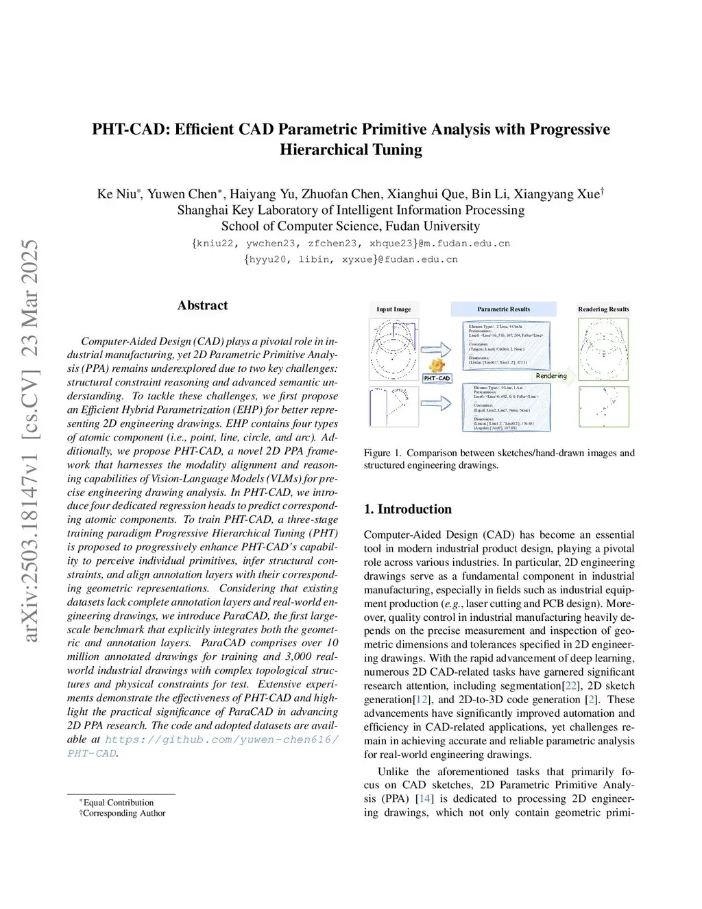 Computer-Aided Design (CAD) plays a pivotal role in industrial manufacturing, yet 2D Parametric Primitive Analysis (PPA) remains underexplored due to two key challenges: structural constraint reasoning and advanced semantic understanding. To tackle these challenges, we first propose an Efficient Hybrid Parametrization (EHP) for better representing 2D engineering drawings. EHP contains four types of atomic component i.e., point, line, circle, and arc). Additionally, we propose PHT-CAD, a novel 2D PPA framework that harnesses the modality alignment and reasoning capabilities of Vision-Language Models (VLMs) for precise engineering drawing analysis. In PHT-CAD, we introduce four dedicated regression heads to predict corresponding atomic components. To train PHT-CAD, a three-stage training paradigm Progressive Hierarchical Tuning (PHT) is proposed to progressively enhance PHT-CAD's capability to perceive individual primitives, infer structural constraints, and align annotation layers with their corresponding geometric representations. Considering that existing datasets lack complete annotation layers and real-world engineering drawings, we introduce ParaCAD, the first large-scale benchmark that explicitly integrates both the geometric and annotation layers. ParaCAD comprises over 10 million annotated drawings for training and 3,000 real-world industrial drawings with complex topological structures and physical constraints for test. Extensive experiments demonstrate the effectiveness of PHT-CAD and highlight the practical significance of ParaCAD in advancing 2D PPA research.