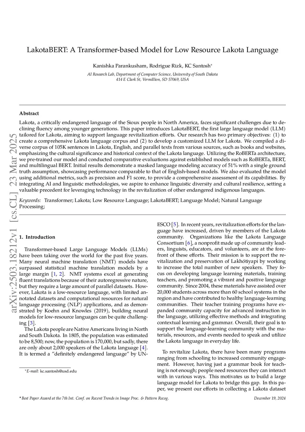Lakota, a critically endangered language of the Sioux people in North America, faces significant challenges due to declining fluency among younger generations. This paper introduces LakotaBERT, the first large language model (LLM) tailored for Lakota, aiming to support language revitalization efforts. Our research has two primary objectives: (1) to create a comprehensive Lakota language corpus and (2) to develop a customized LLM for Lakota. We compiled a diverse corpus of 105K sentences in Lakota, English, and parallel texts from various sources, such as books and websites, emphasizing the cultural significance and historical context of the Lakota language. Utilizing the RoBERTa architecture, we pre-trained our model and conducted comparative evaluations against established models such as RoBERTa, BERT, and multilingual BERT. Initial results demonstrate a masked language modeling accuracy of 51% with a single ground truth assumption, showcasing performance comparable to that of English-based models. We also evaluated the model using additional metrics, such as precision and F1 score, to provide a comprehensive assessment of its capabilities. By integrating AI and linguistic methodologies, we aspire to enhance linguistic diversity and cultural resilience, setting a valuable precedent for leveraging technology in the revitalization of other endangered indigenous languages.