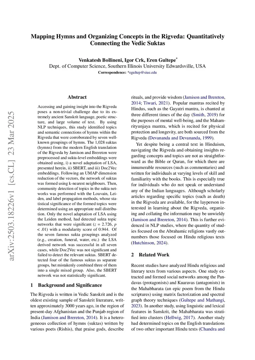 Accessing and gaining insight into the Rigveda poses a non-trivial challenge due to its extremely ancient Sanskrit language, poetic structure, and large volume of text. By using NLP techniques, this study identified topics and semantic connections of hymns within the Rigveda that were corroborated by seven well-known groupings of hymns. The 1,028 suktas (hymns) from the modern English translation of the Rigveda by Jamison and Brereton were preprocessed and sukta-level embeddings were obtained using, i) a novel adaptation of LSA, presented herein, ii) SBERT, and iii) Doc2Vec embeddings. Following an UMAP dimension reduction of the vectors, the network of suktas was formed using k-nearest neighbours. Then, community detection of topics in the sukta networks was performed with the Louvain, Leiden, and label propagation methods, whose statistical significance of the formed topics were determined using an appropriate null distribution. Only the novel adaptation of LSA using the Leiden method, had detected sukta topic networks that were significant (z = 2.726, p < .01) with a modularity score of 0.944. Of the seven famous sukta groupings analyzed (e.g., creation, funeral, water, etc.) the LSA derived network was successful in all seven cases, while Doc2Vec was not significant and failed to detect the relevant suktas. SBERT detected four of the famous suktas as separate groups, but mistakenly combined three of them into a single mixed group. Also, the SBERT network was not statistically significant.