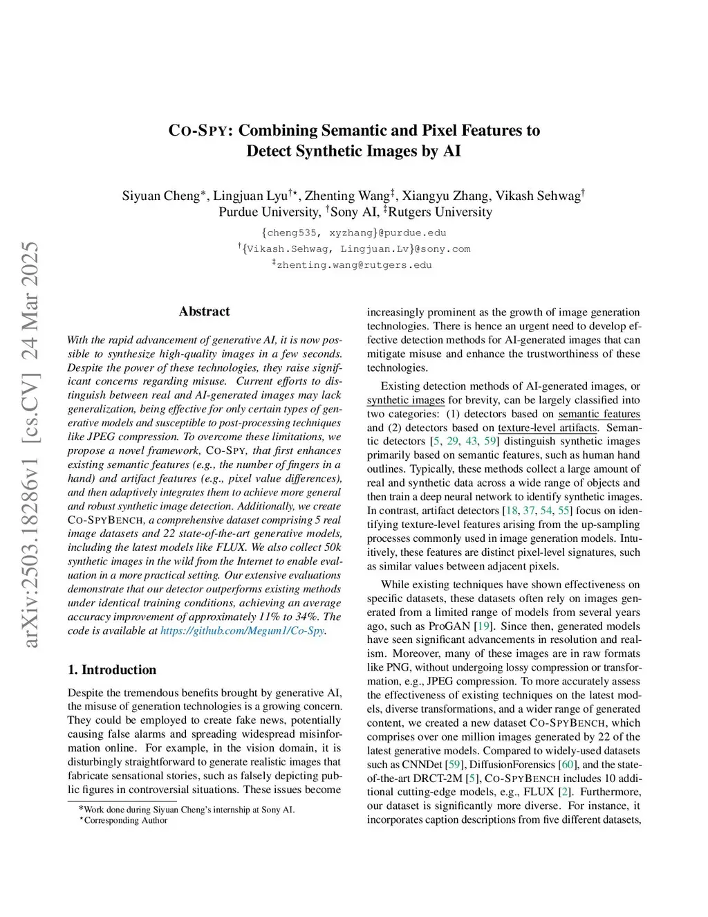 With the rapid advancement of generative AI, it is now possible to synthesize high-quality images in a few seconds. Despite the power of these technologies, they raise significant concerns regarding misuse. Current efforts to distinguish between real and AI-generated images may lack generalization, being effective for only certain types of generative models and susceptible to post-processing techniques like JPEG compression. To overcome these limitations, we propose a novel framework, Co-Spy, that first enhances existing semantic features (e.g., the number of fingers in a hand) and artifact features (e.g., pixel value differences), and then adaptively integrates them to achieve more general and robust synthetic image detection. Additionally, we create Co-Spy-Bench, a comprehensive dataset comprising 5 real image datasets and 22 state-of-the-art generative models, including the latest models like FLUX. We also collect 50k synthetic images in the wild from the Internet to enable evaluation in a more practical setting. Our extensive evaluations demonstrate that our detector outperforms existing methods under identical training conditions, achieving an average accuracy improvement of approximately 11% to 34%. The code is available atthis https URL.