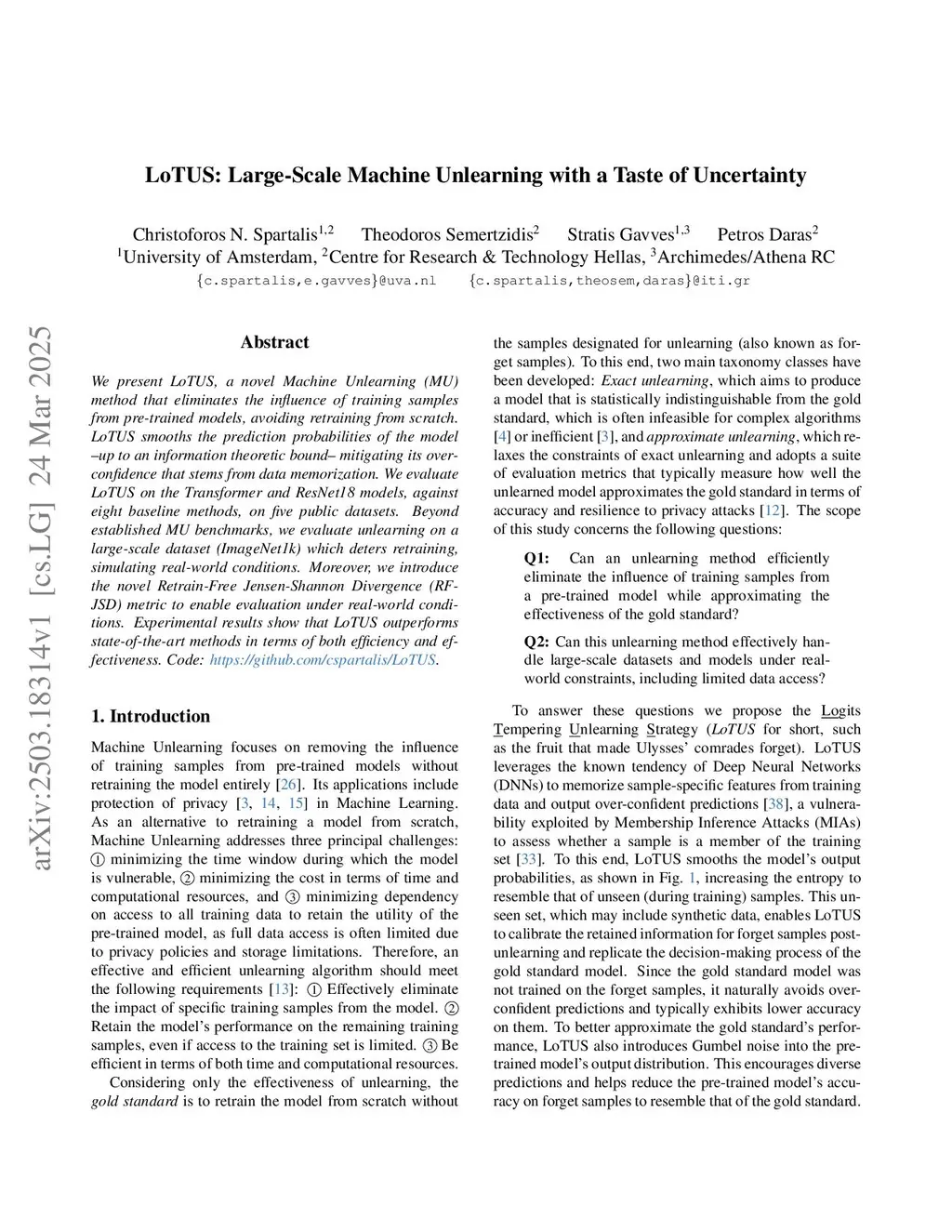 We present LoTUS, a novel Machine Unlearning (MU) method that eliminates the influence of training samples from pre-trained models, avoiding retraining from scratch. LoTUS smooths the prediction probabilities of the model up to an information-theoretic bound, mitigating its over-confidence stemming from data memorization. We evaluate LoTUS on Transformer and ResNet18 models against eight baselines across five public datasets. Beyond established MU benchmarks, we evaluate unlearning on ImageNet1k, a large-scale dataset, where retraining is impractical, simulating real-world conditions. Moreover, we introduce the novel Retrain-Free Jensen-Shannon Divergence (RF-JSD) metric to enable evaluation under real-world conditions. The experimental results show that LoTUS outperforms state-of-the-art methods in terms of both efficiency and effectiveness. Code:this https URL.