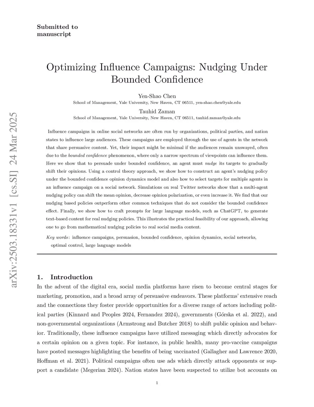 Influence campaigns in online social networks are often run by organizations, political parties, and nation states to influence large audiences. These campaigns are employed through the use of agents in the network that share persuasive content. Yet, their impact might be minimal if the audiences remain unswayed, often due to the bounded confidence phenomenon, where only a narrow spectrum of viewpoints can influence them. Here we show that to persuade under bounded confidence, an agent must nudge its targets to gradually shift their opinions. Using a control theory approach, we show how to construct an agent's nudging policy under the bounded confidence opinion dynamics model and also how to select targets for multiple agents in an influence campaign on a social network. Simulations on real Twitter networks show that a multi-agent nudging policy can shift the mean opinion, decrease opinion polarization, or even increase it. We find that our nudging based policies outperform other common techniques that do not consider the bounded confidence effect. Finally, we show how to craft prompts for large language models, such as ChatGPT, to generate text-based content for real nudging policies. This illustrates the practical feasibility of our approach, allowing one to go from mathematical nudging policies to real social media content.