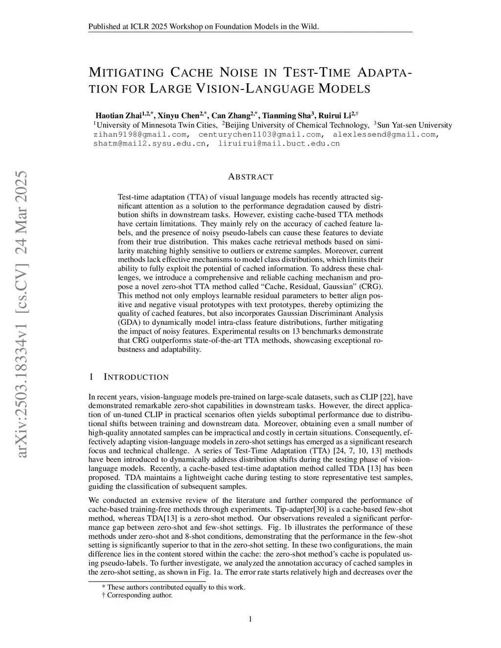 Test-time adaptation (TTA) of visual language models has recently attracted significant attention as a solution to the performance degradation caused by distribution shifts in downstream tasks. However, existing cache-based TTA methods have certain limitations. They mainly rely on the accuracy of cached feature labels, and the presence of noisy pseudo-labels can cause these features to deviate from their true distribution. This makes cache retrieval methods based on similarity matching highly sensitive to outliers or extreme samples. Moreover, current methods lack effective mechanisms to model class distributions, which limits their ability to fully exploit the potential of cached information. To address these challenges, we introduce a comprehensive and reliable caching mechanism and propose a novel zero-shot TTA method called "Cache, Residual, Gaussian" (CRG). This method not only employs learnable residual parameters to better align positive and negative visual prototypes with text prototypes, thereby optimizing the quality of cached features, but also incorporates Gaussian Discriminant Analysis (GDA) to dynamically model intra-class feature distributions, further mitigating the impact of noisy features. Experimental results on 13 benchmarks demonstrate that CRG outperforms state-of-the-art TTA methods, showcasing exceptional robustness and adaptability.