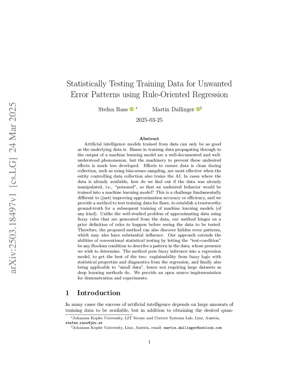 Artificial intelligence models trained from data can only be as good as the underlying data is. Biases in training data propagating through to the output of a machine learning model are a well-documented and well-understood phenomenon, but the machinery to prevent these undesired effects is much less developed. Efforts to ensure data is clean during collection, such as using bias-aware sampling, are most effective when the entity controlling data collection also trains the AI. In cases where the data is already available, how do we find out if the data was already manipulated, i.e., ``poisoned'', so that an undesired behavior would be trained into a machine learning model? This is a challenge fundamentally different to (just) improving approximation accuracy or efficiency, and we provide a method to test training data for flaws, to establish a trustworthy ground-truth for a subsequent training of machine learning models (of any kind). Unlike the well-studied problem of approximating data using fuzzy rules that are generated from the data, our method hinges on a prior definition of rules to happen before seeing the data to be tested. Therefore, the proposed method can also discover hidden error patterns, which may also have substantial influence. Our approach extends the abilities of conventional statistical testing by letting the ``test-condition'' be any Boolean condition to describe a pattern in the data, whose presence we wish to determine. The method puts fuzzy inference into a regression model, to get the best of the two: explainability from fuzzy logic with statistical properties and diagnostics from the regression, and finally also being applicable to ``small data'', hence not requiring large datasets as deep learning methods do. We provide an open source implementation for demonstration and experiments.