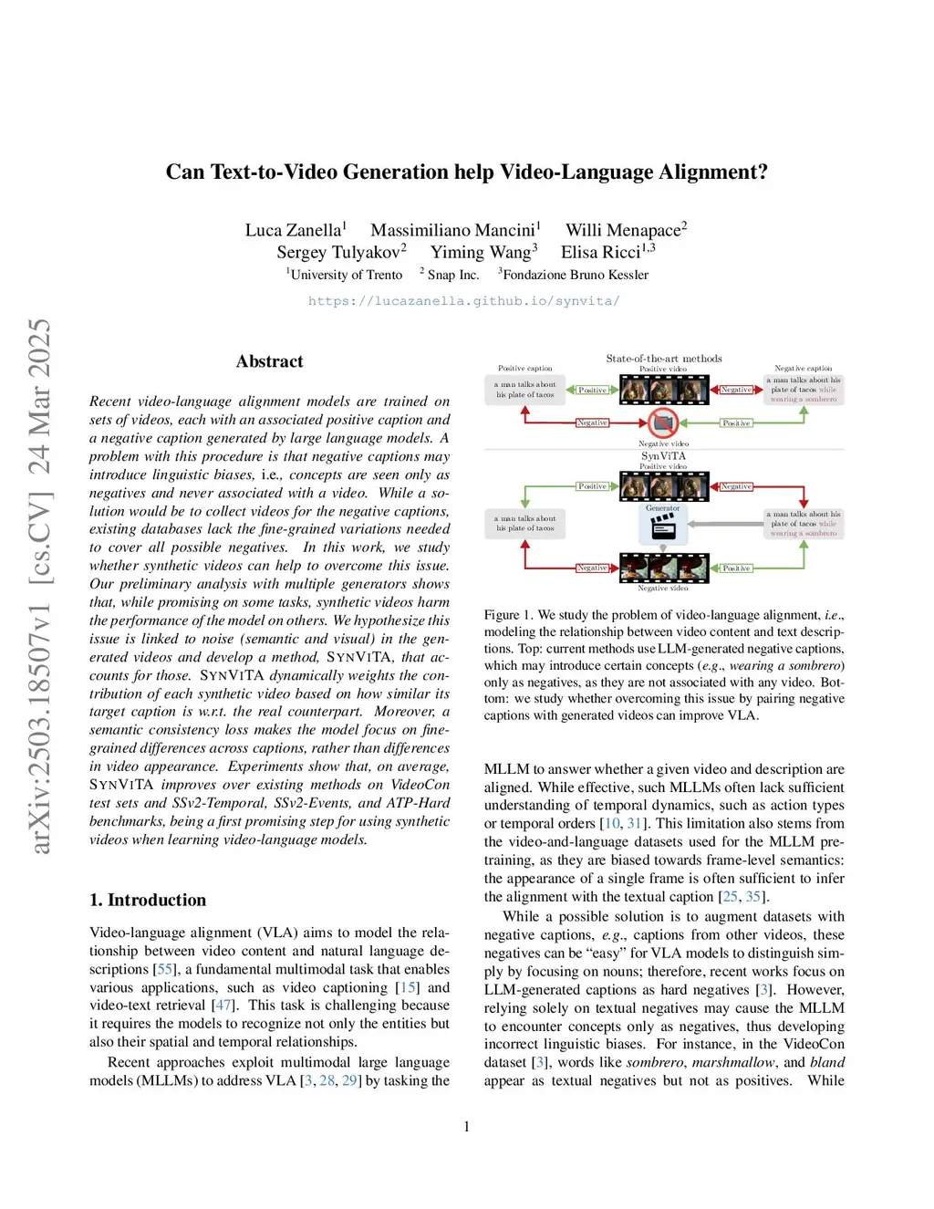 Recent video-language alignment models are trained on sets of videos, each with an associated positive caption and a negative caption generated by large language models. A problem with this procedure is that negative captions may introduce linguistic biases, i.e., concepts are seen only as negatives and never associated with a video. While a solution would be to collect videos for the negative captions, existing databases lack the fine-grained variations needed to cover all possible negatives. In this work, we study whether synthetic videos can help to overcome this issue. Our preliminary analysis with multiple generators shows that, while promising on some tasks, synthetic videos harm the performance of the model on others. We hypothesize this issue is linked to noise (semantic and visual) in the generated videos and develop a method, SynViTA, that accounts for those. SynViTA dynamically weights the contribution of each synthetic video based on how similar its target caption is w.r.t. the real counterpart. Moreover, a semantic consistency loss makes the model focus on fine-grained differences across captions, rather than differences in video appearance. Experiments show that, on average, SynViTA improves over existing methods on VideoCon test sets and SSv2-Temporal, SSv2-Events, and ATP-Hard benchmarks, being a first promising step for using synthetic videos when learning video-language models.