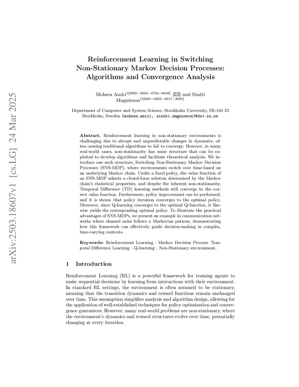 Reinforcement Learning in Switching Non-Stationary Markov Decision Processes: Algorithms and Convergence Analysis
